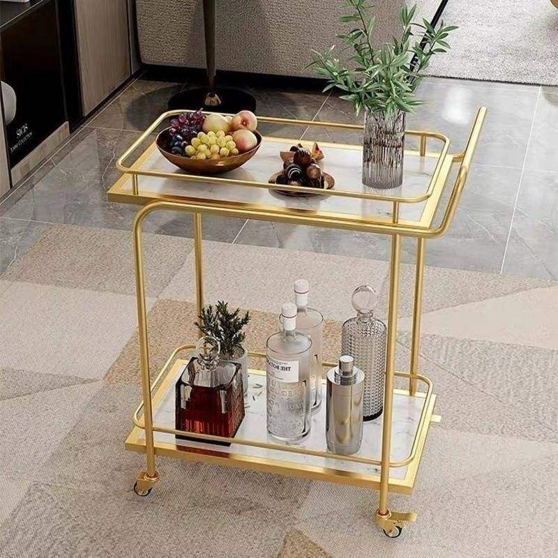 รถเข็นเหล็กดีไซน์ทันสมัยพร้อมเคลือบทองและชั้นวางกระจก รถเข็นเสิร์ฟแบบมีล้อ สำหรับบาร์ในบ้าน ห้องครัว ห้องรับประทานอาหาร ใช้จัดแสดงเครื่องดื่ม