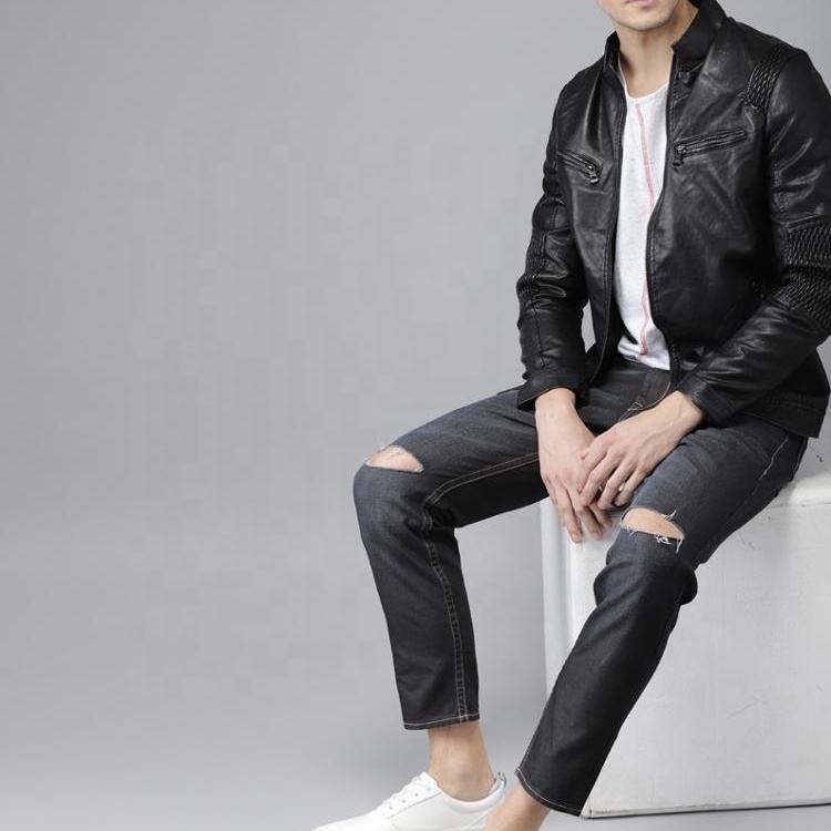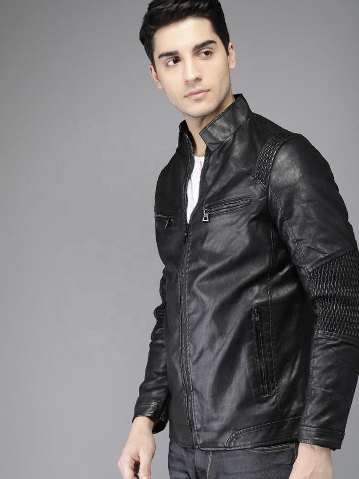 สไตล์หนังสำหรับชายซิปสไตล์สีดำหนังแจ็คเก็ตแขนไหล่ติดสไตล์] โดย EVERGLOW