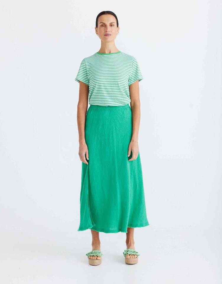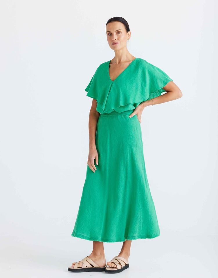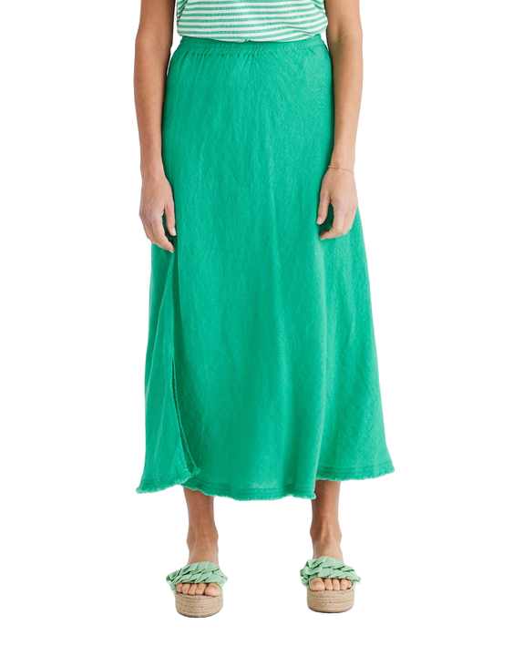 กระโปรงผ้าลินินทรงสวยทันสมัย เอวยางยืด ผ่าข้าง แต่งชายรุ่ย 100% ผ้าลินิน สีเขียวแอปเปิ้ล สำหรับผู้หญิง