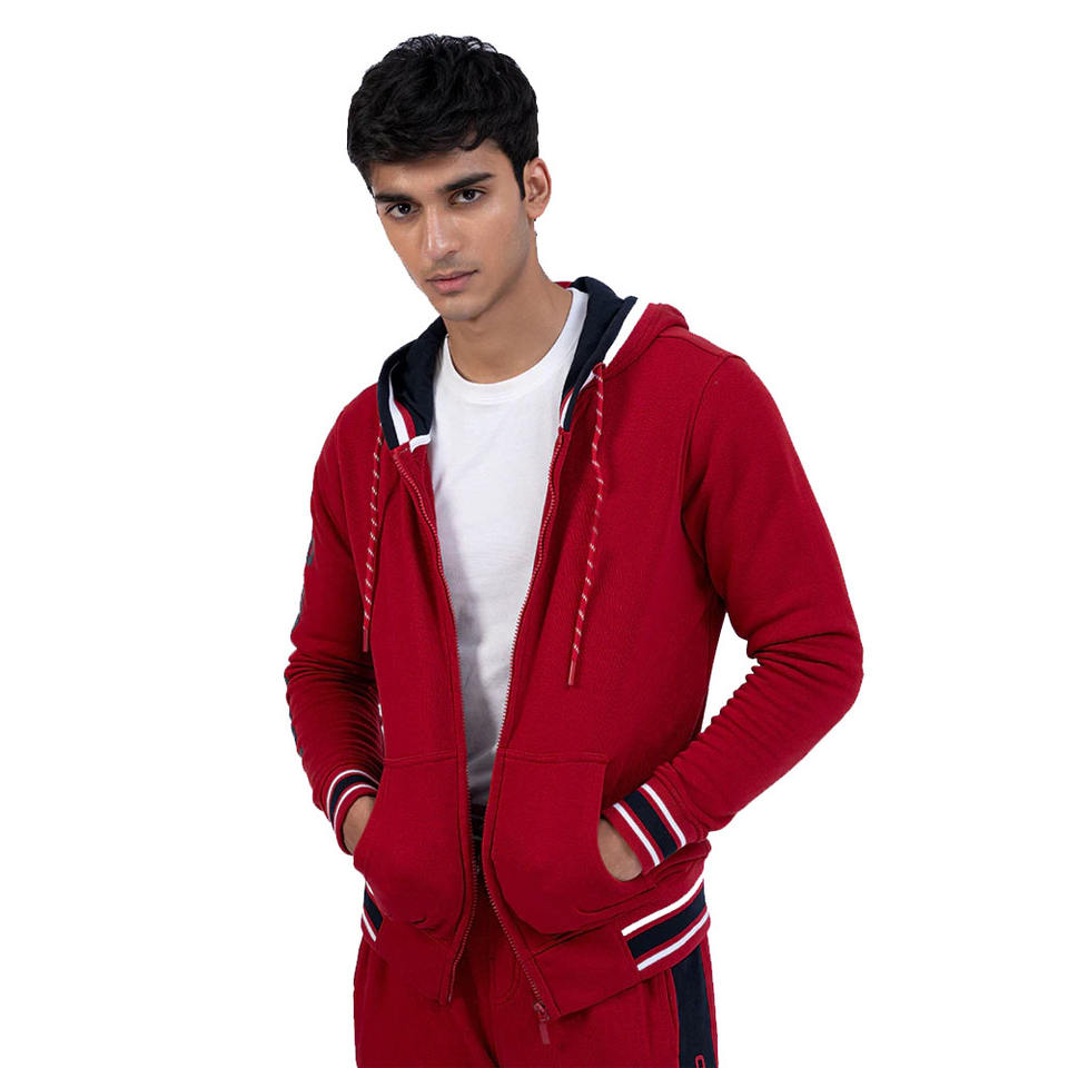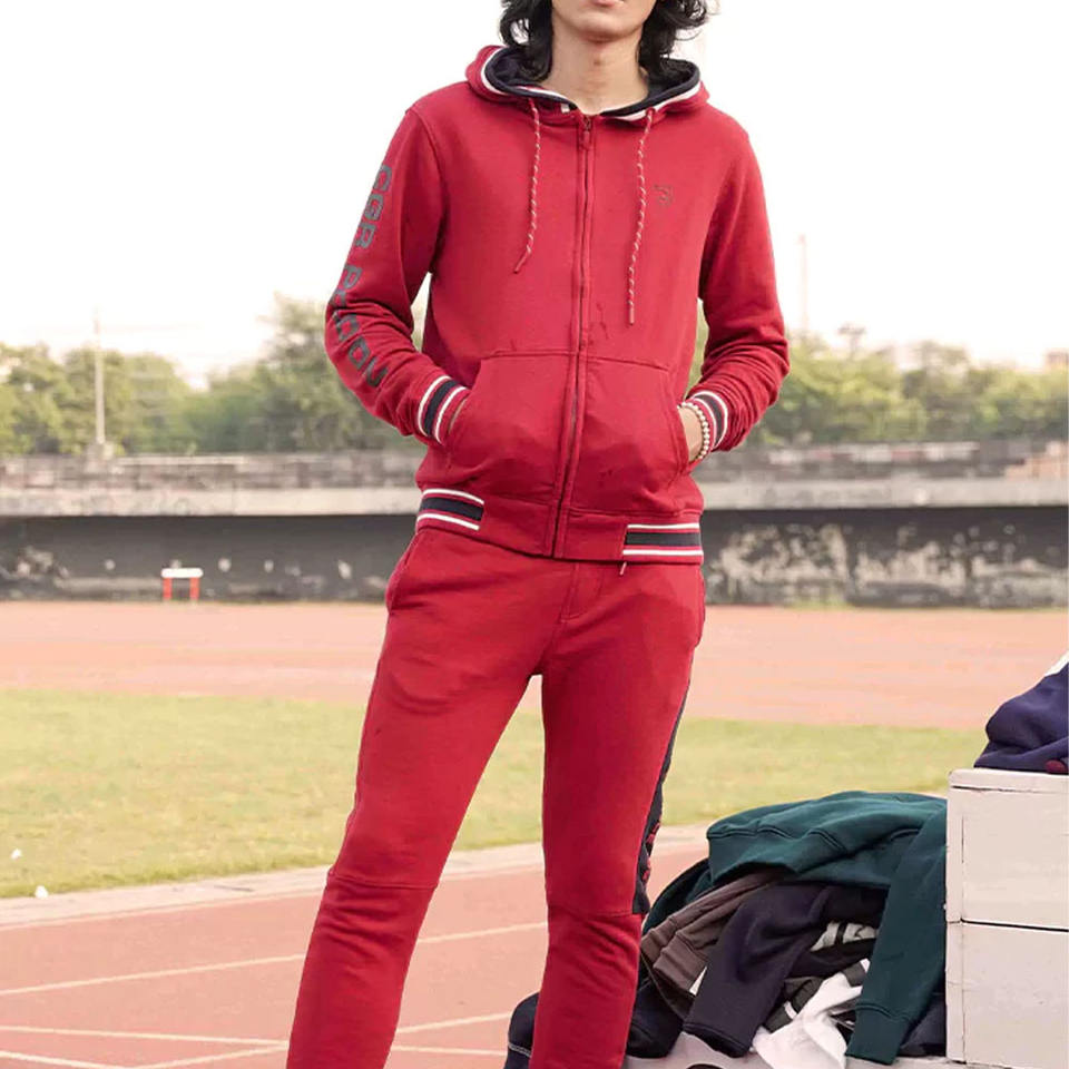 ชุดวอร์มมีซิปสำหรับผู้ชายผ้าฝ้ายสีน้ำตาลแดง100% มีสไตล์ออกแบบได้ตามต้องการสำหรับยิมฟิตเนสระบายอากาศได้ดีและเป็นมิตรกับสิ่งแวดล้อม