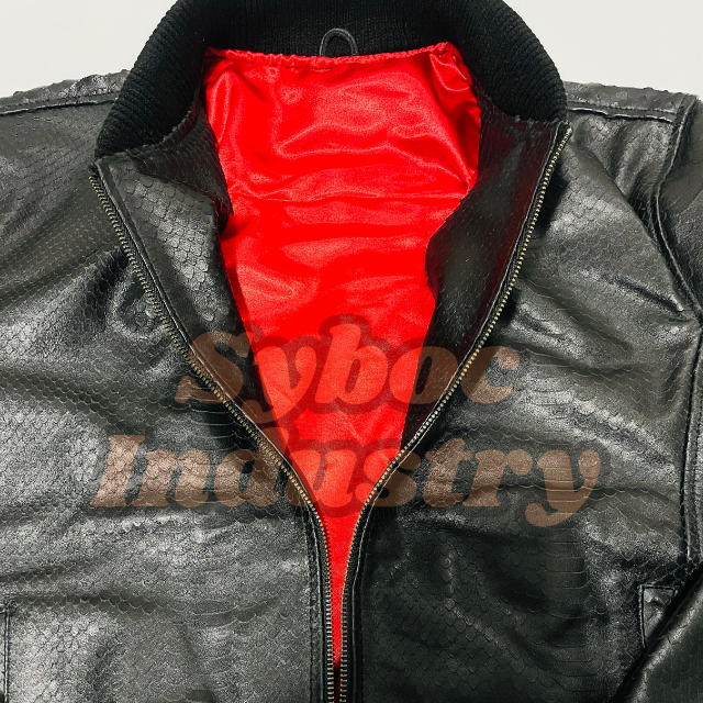 เสื้อแจ็คเก็ตหนังสีดำนูนลายงูหลามของผู้ชายบอมเบอร์หนังแท้ออกแบบได้เองสไตล์ใหม่พิมพ์ลายงู