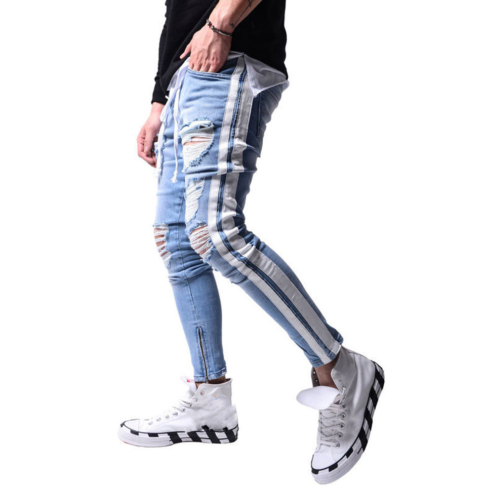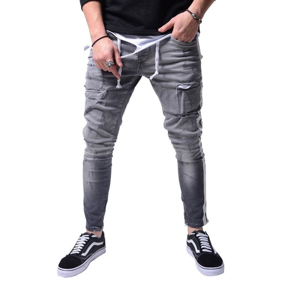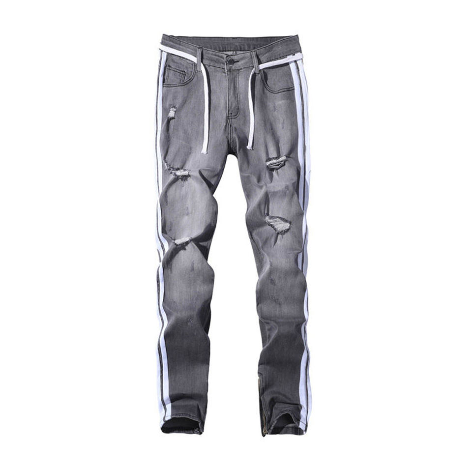 กางเกงยีนส์ทรงตรงของผู้ชายสไตล์สตรีทแวร์ระบายอากาศได้พร้อมผ้าปักลายปักลายสีขาวซัก