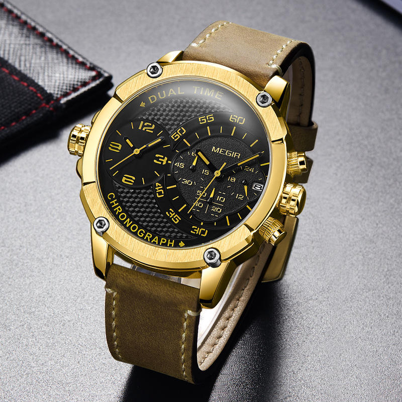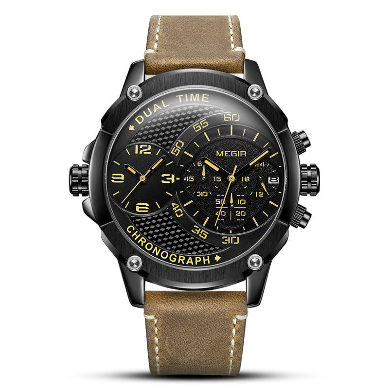 นาฬิกาข้อมือสำหรับผู้ชายสายหนังแท้นาฬิกาควอตซ์สองชั่วโมงดีไซน์อเนกประสงค์