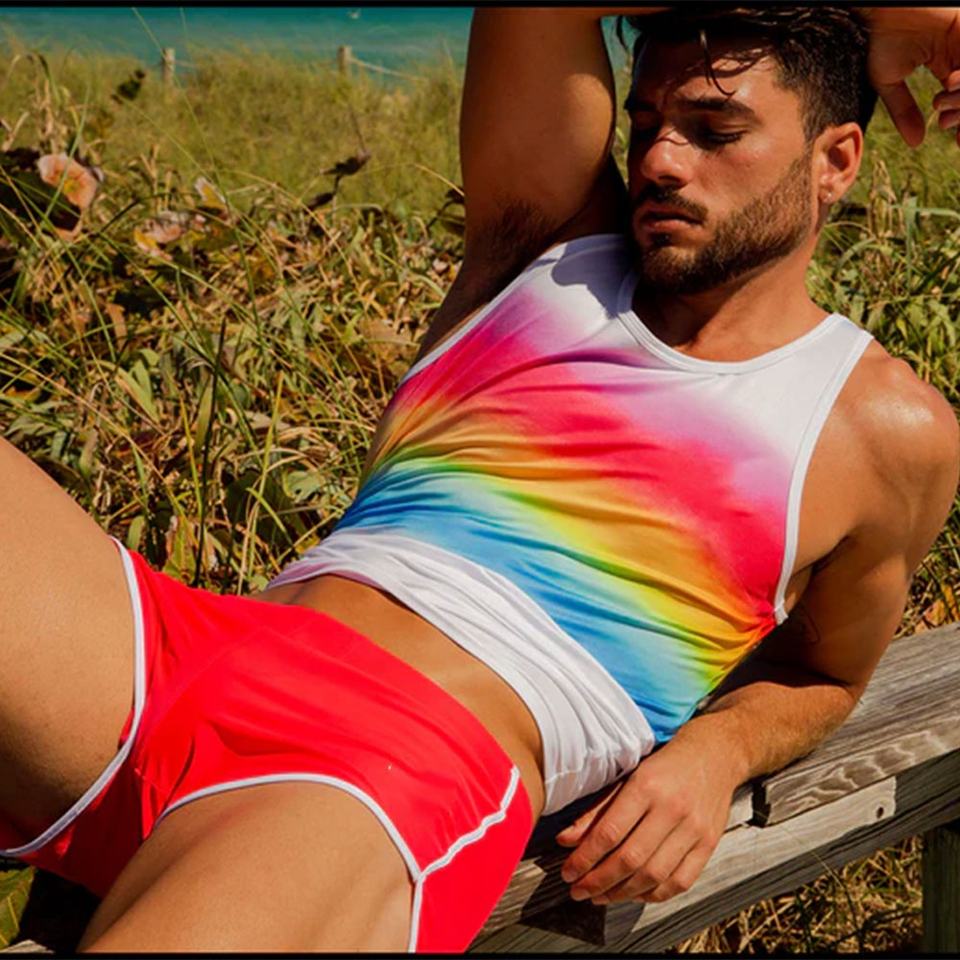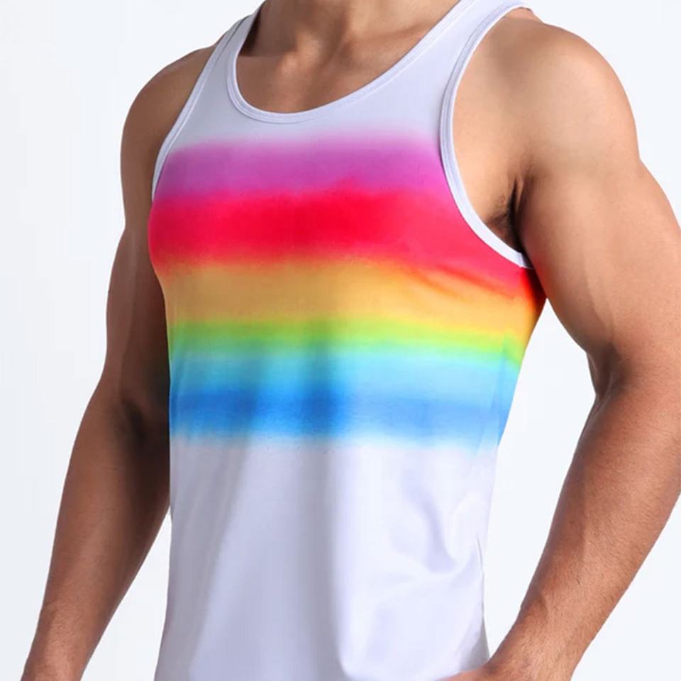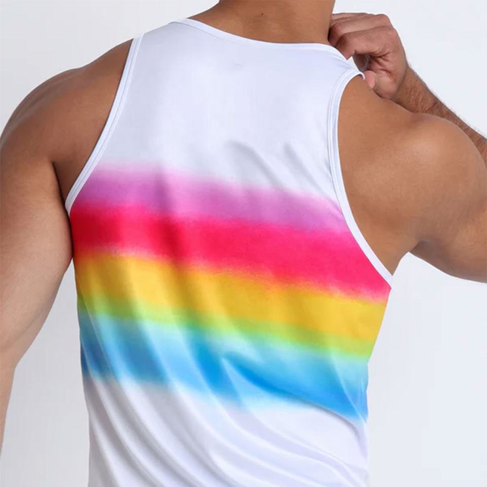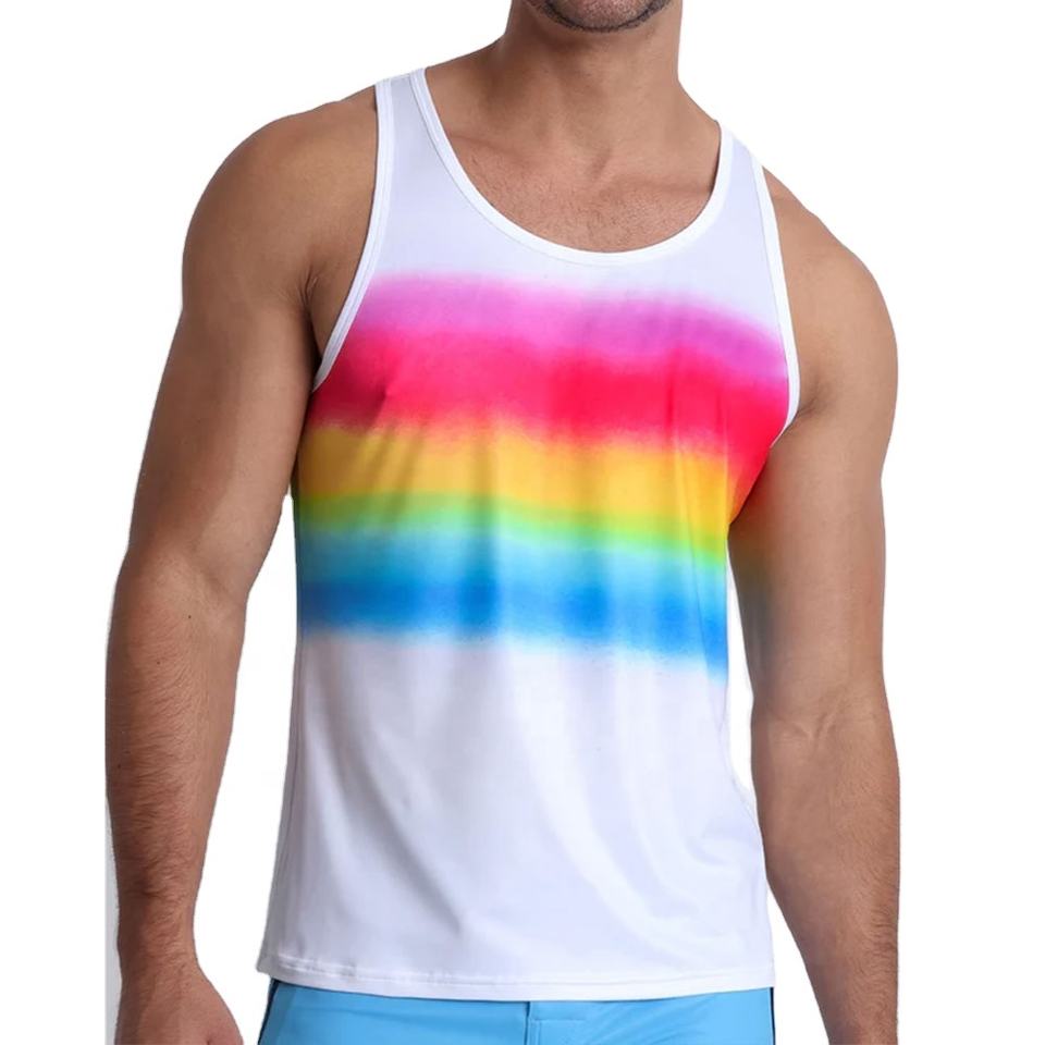 เสื้อกล้ามชายสีรุ้งไล่ระดับสีมีสไตล์เสื้อแขนกุดสีสันสดใสระบายอากาศได้น้ำหนักเบาออกแบบได้ตามต้องการ