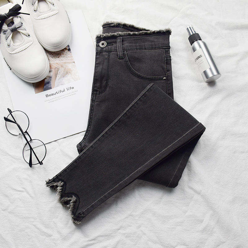 กางเกงทรงดินสอขาตรงเข้ารูปของผู้ชายกางเกงยีนส์ซักสีดำดีไซน์ขาดกางเกงขายาวลำลองน้ำหนักเบากลางอินเทรนด์