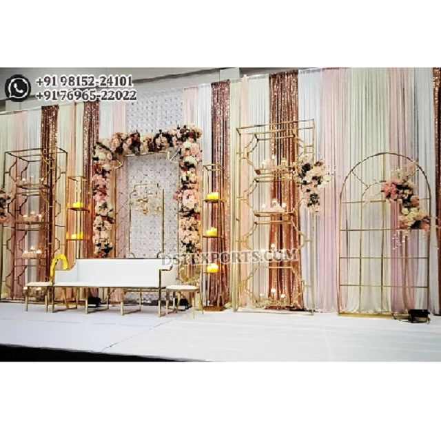 ฉากหลังเชิงเทียนโลหะสีทองติดผนังมีสไตล์ฉากหลังเวทีแต่งงานฉากหลังโลหะ & เทียนผนังงานแต่งงานที่งดงามตกแต่งเวที UK