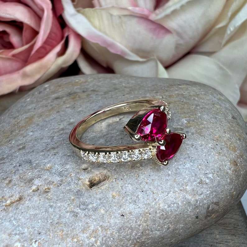 ลูกแพร์ที่ทันสมัยตัดสีแดงทับทิม14K สีเหลืองทองพลอย Toi et Moi แหวนหมั้นสำหรับผู้หญิงเครื่องประดับเพชรชั้นดีในราคาที่ดีที่สุด
