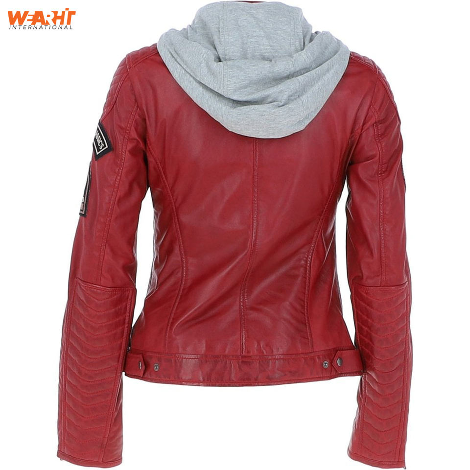แจ็กเก็ตไบเกอร์สำหรับผู้หญิงหนังแท้สีแดงมีซิปปิดถอดออกได้เสื้อแจ็คเก็ตแฟชั่น