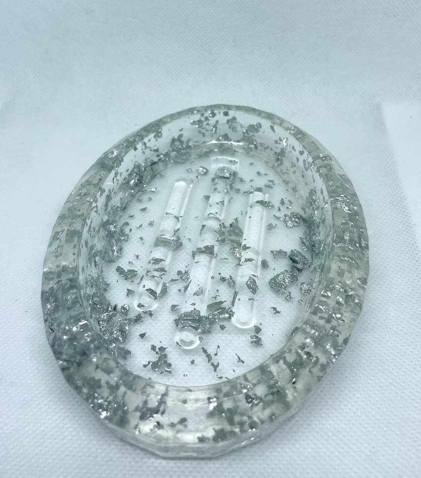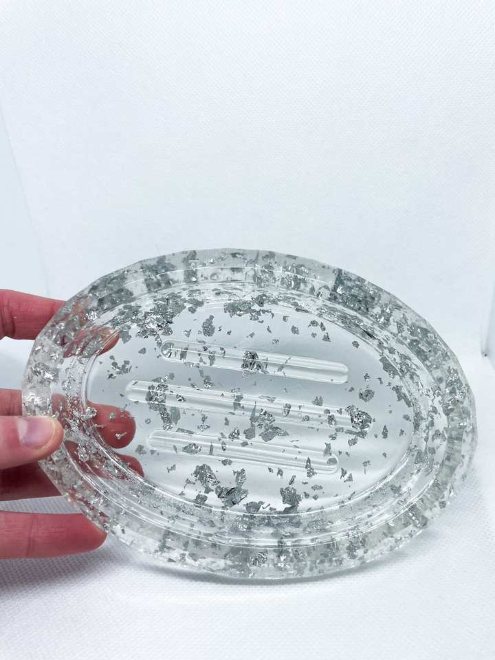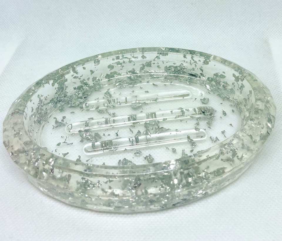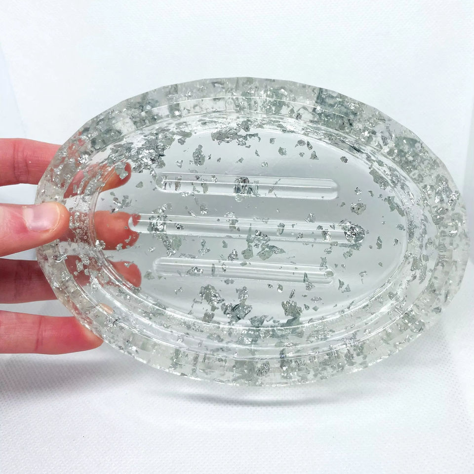 ถาดวางสบู่แบบวงกลมทรงสี่เหลี่ยมถาดทำจากเรซินใสแบบใหม่มีแผ่นฟอยล์สีทองฝังอยู่ด้านใน