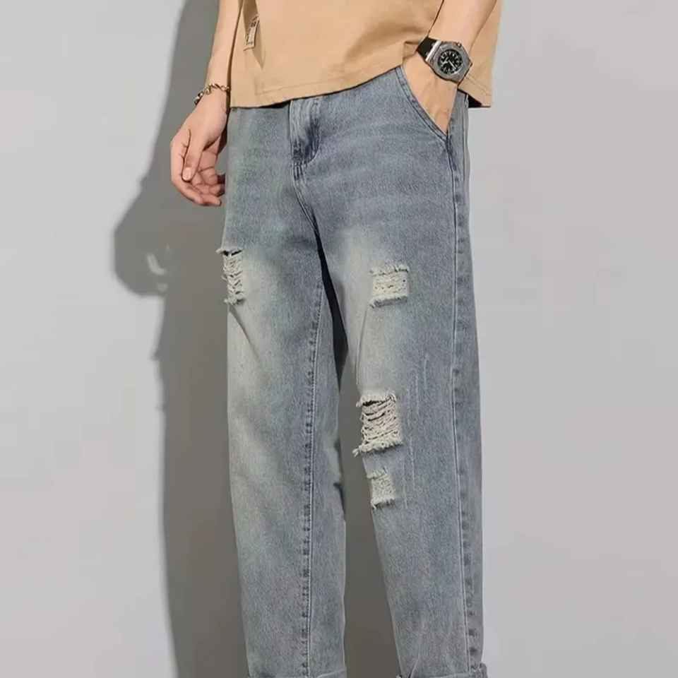กางเกงยีนส์ขาดทันสมัยสำหรับผู้ชายกางเกงยีนส์ทรงหลวมเสียชุดสตรีทแวร์ลำลองเหมาะสำหรับฤดูร้อนทุกวัน
