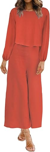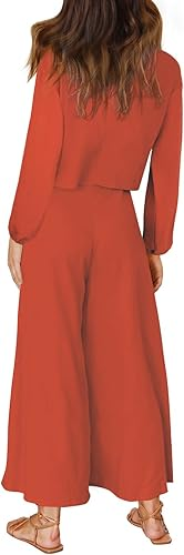 ชุดเดรสผู้หญิงสีส้มสนิมมีสไตล์ชุดเสื้อครอปคอกลมแขนยาวและชุดกางเกงขากว้างยาวถึงพื้นสีส้มมีสไตล์