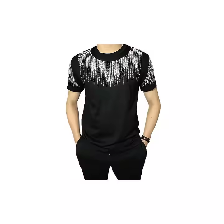เสื้อยืดผ้าซาตินเข้ารูปมีสไตล์ด้วยการปักพลอยเทียมแขนสั้นดีไซน์ทางการมีลวดลายตัวละครว่างเปล่า