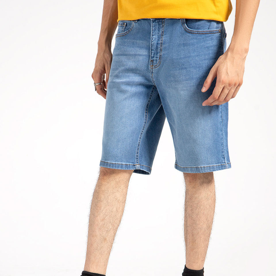 กางเกงขาสั้นผ้ายีนส์พอดีตัวสำหรับผู้ชายผ้าคอตตอนสีฟ้าดีไซน์ลำลองมีสไตล์ฤดูร้อน
