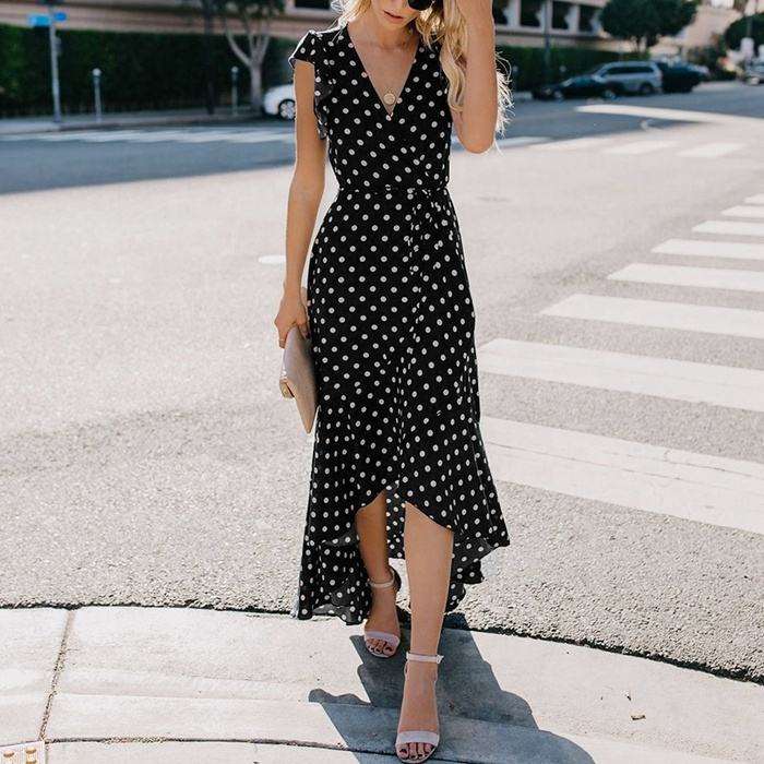 เดรสแม็กซี่แขนกุดสำหรับผู้หญิงชุดเดรสคอวีพิมพ์ลายดอกไม้ผ้าทอดีจีบสั้นผ้าทอปรับแต่งเองได้สำหรับฤดูร้อน