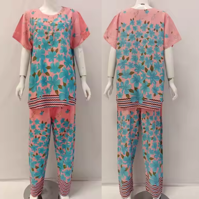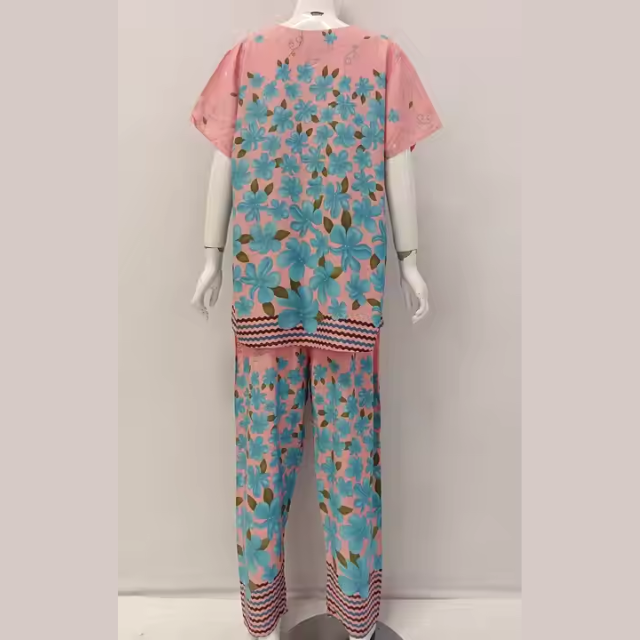 ชุดนอนผ้าเรยอนเนื้อนุ่ม 2 ชิ้นสำหรับผู้หญิง สไตล์ฤดูร้อน แขนสั้น กางเกงขายาวระดับเข่า