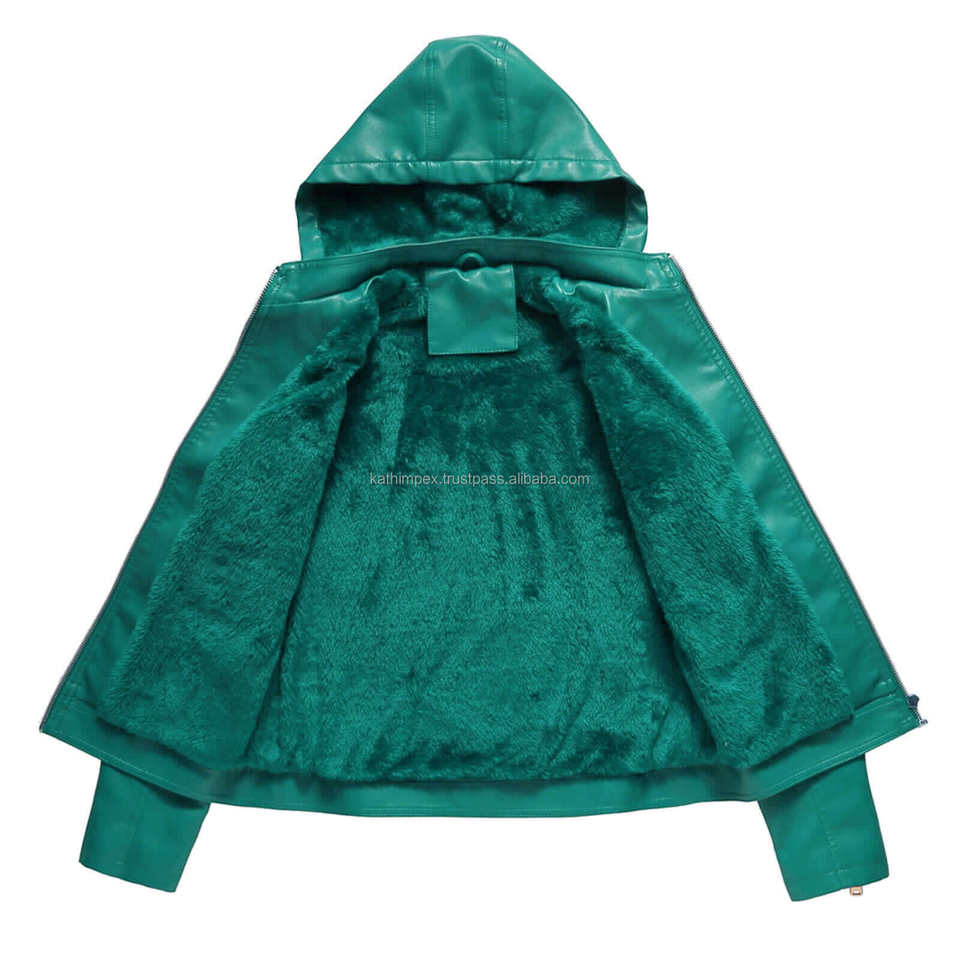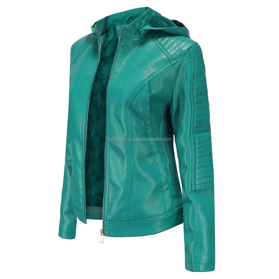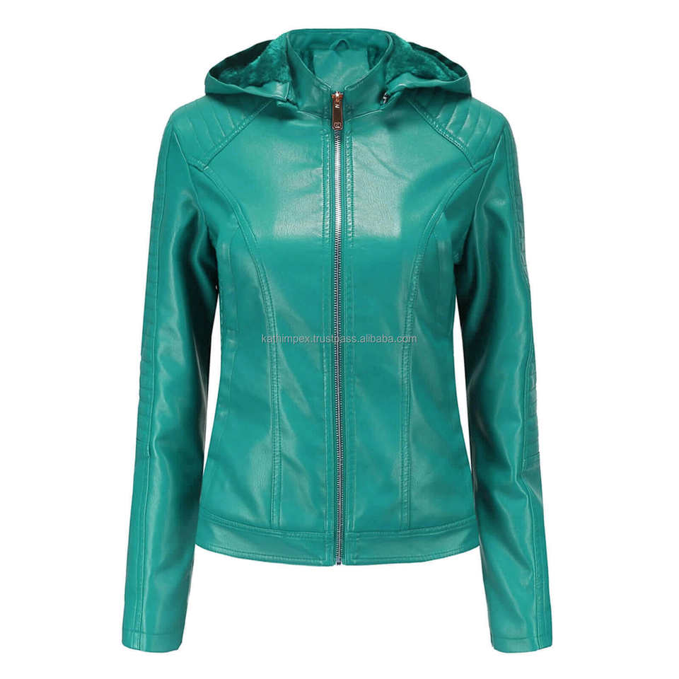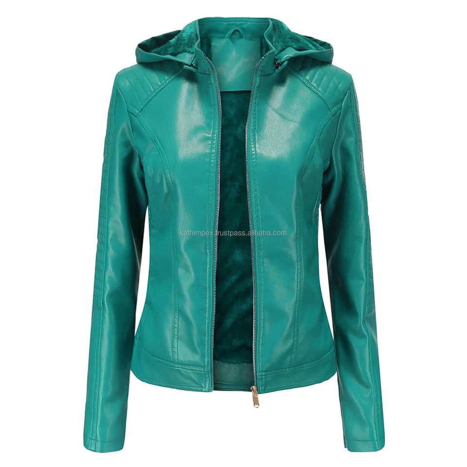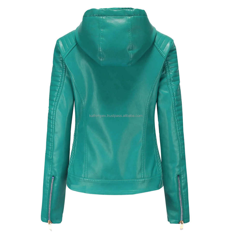 แจ็กเก็ตหนังสำหรับผู้หญิงอเนกประสงค์มีฮู้ดสีเขียวเป็ดเป็ดทันสมัยมีซิปปิดด้วยซิปสวมใส่สบายทนทาน