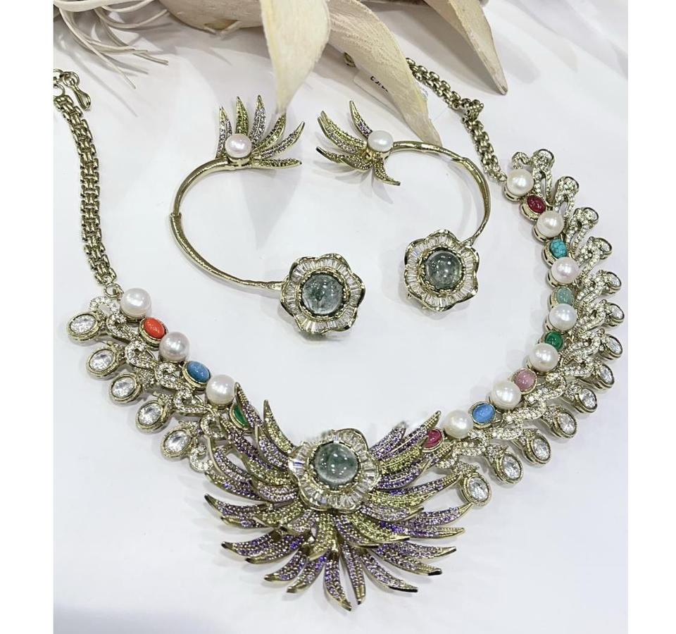 Stylish Trendy Best Quality Gold Plated Zircon Statement Fusion Necklace and Earring Set for Women's Engagement and Wedding