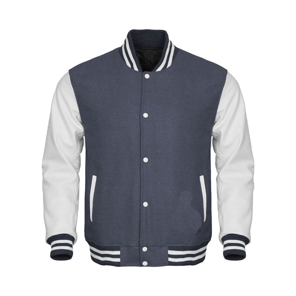 แจ็กเก็ตสีเทา-ขาวมีสไตล์แจ็กเก็ตเบสบอลสีเทา-ขาวมีสไตล์ไม่เหมือนใครผ้าวูลด้านหน้าไฮสตรีทสไตล์วินเทจตกแต่งแบบเลตเทจ