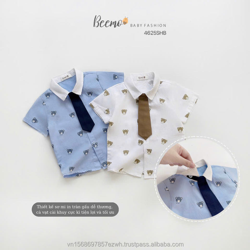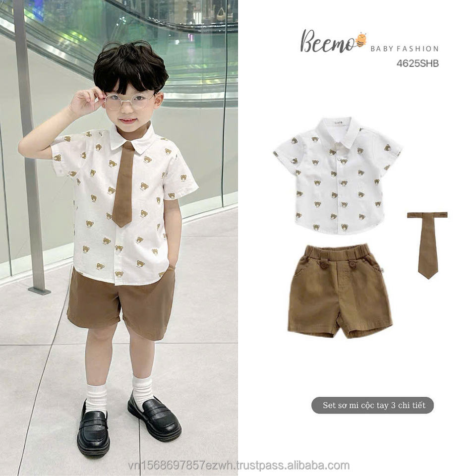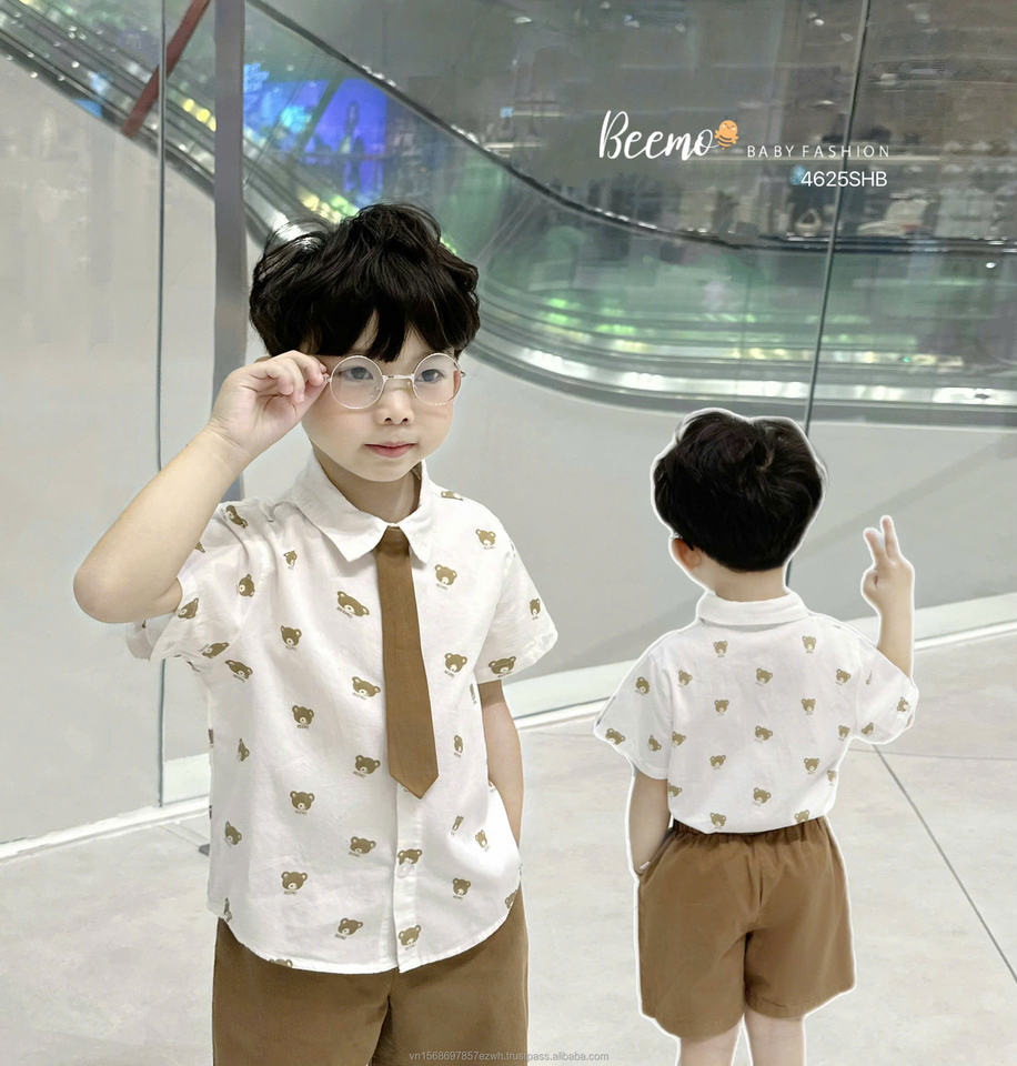 ชุดเซ็ตฤดูร้อนสไตล์เท่ห์สำหรับเด็กผู้ชาย ชุดลำลองสไตล์อังกฤษสุดหล่อ ชุดทางการลายหมี เสื้อเชิ้ตและกางเกงขาสั้น + เนคไท