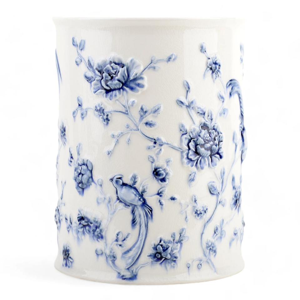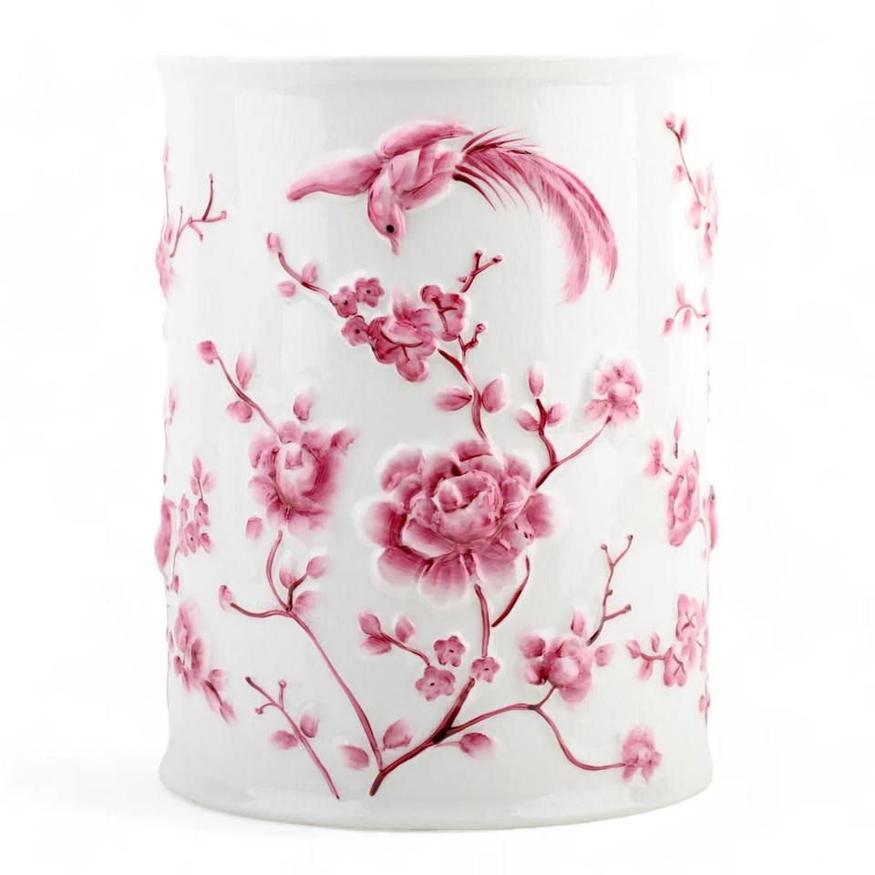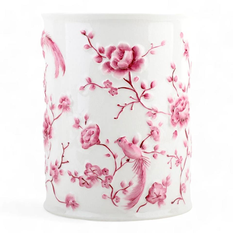 ถังขยะโลหะสีขาวทันสมัยพร้อมลายพิมพ์ดอกไม้รูปนกสีชมพู เหมาะสำหรับห้องนอน ห้องเด็ก ห้องครัว หรือตกแต่งบ้าน และเป็นของขวัญ