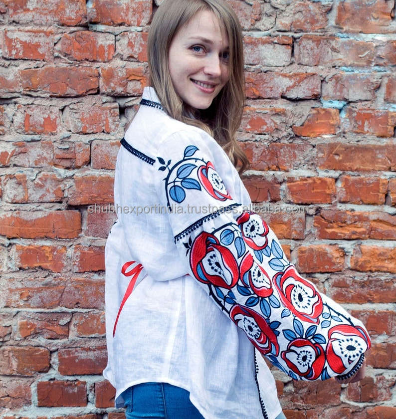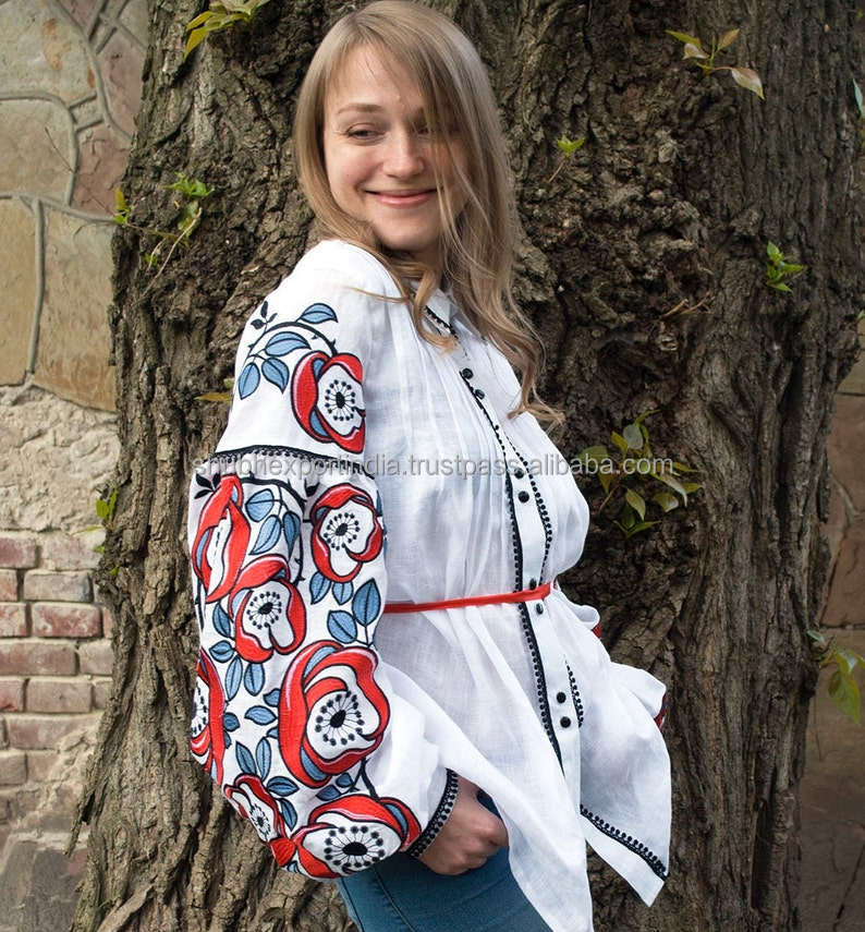 เดรสผ้าฝ้ายสีขาวสไตล์ยูเครน ปักลายสวยงาม คอวี แขนยาว ทรงลำลอง แต่งพู่และซิป มีหลายขนาด