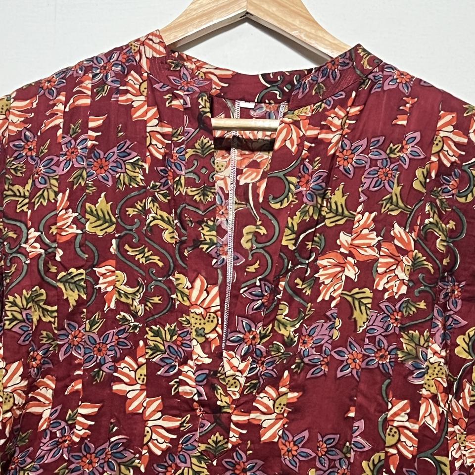 เดรสผ้าฝ้ายสีแดงทรงสวยสำหรับผู้หญิง ดีไซน์เป็นมิตรต่อสิ่งแวดล้อม คอวี แขนทรงกระดิ่ง แต่งลายชาติพันธุ์ เอวเข้ารูป ดีไซน์เนอร์คุร์ติ
