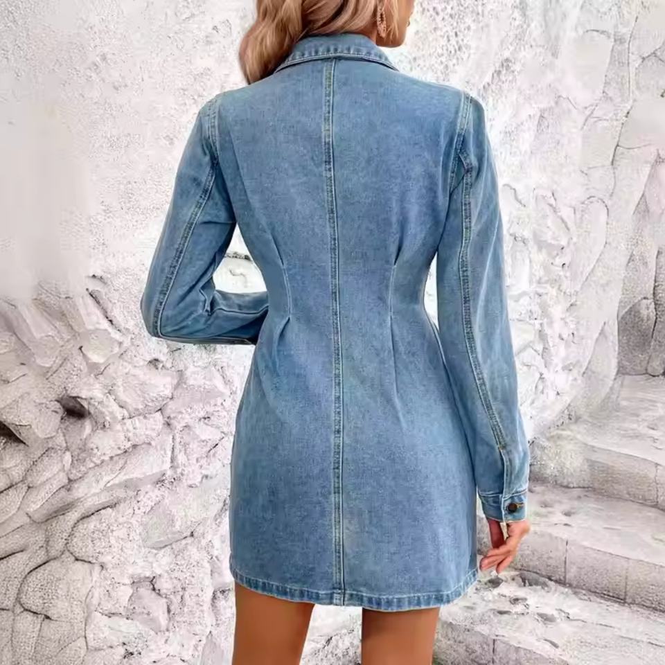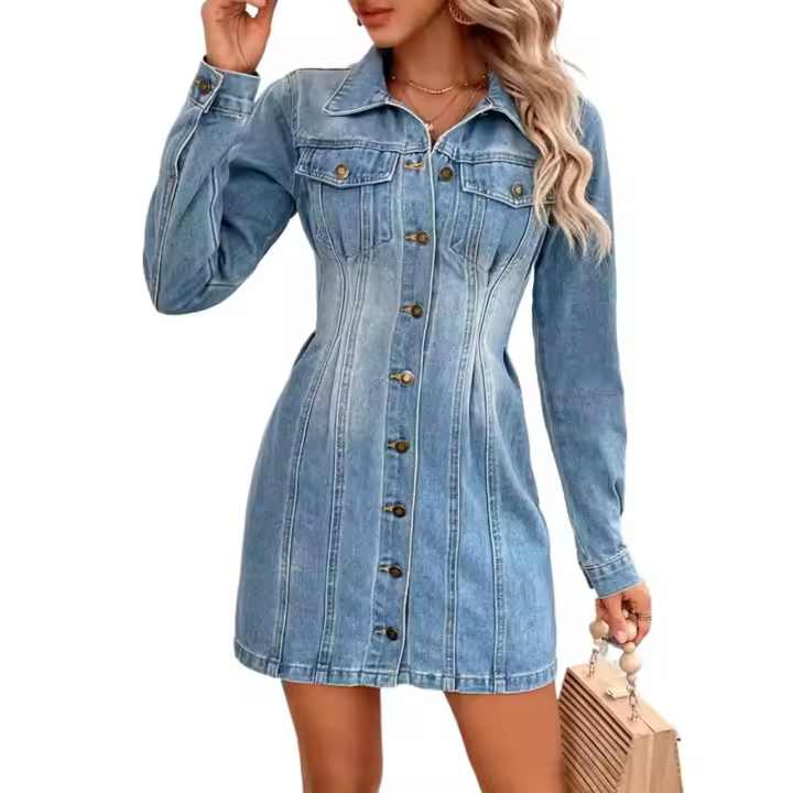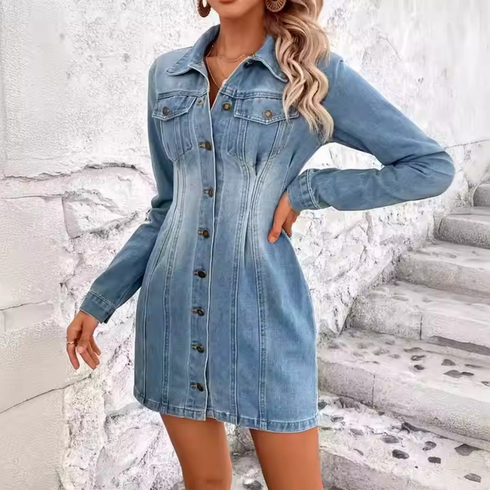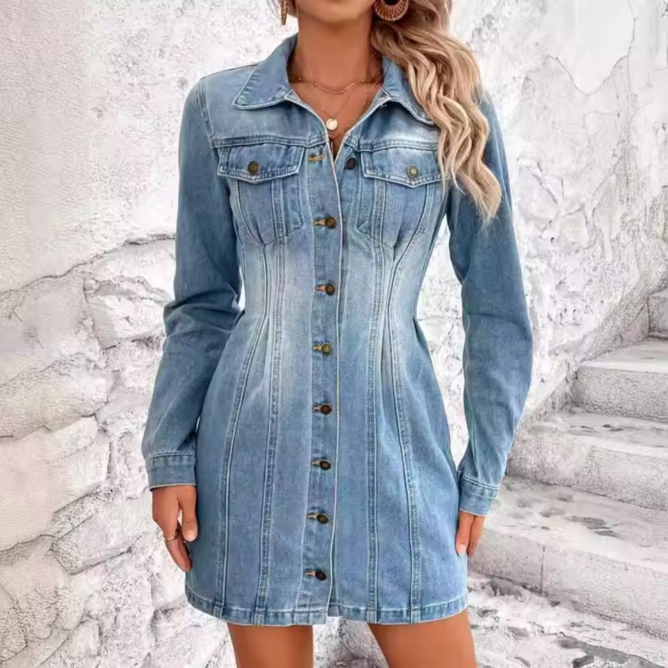เดรสยีนส์แขนยาวสไตล์ลำลองสำหรับผู้หญิง ลุคซัมเมอร์เก๋ไก๋ ซักฟอกแล้ว ติดกระดุม