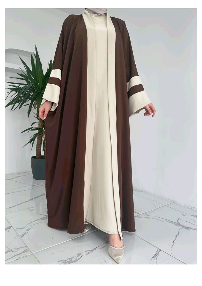 อาบายะห์สีน้ำตาลสองสีสำหรับผู้หญิง ดีไซน์ทันสมัย พร้อมฮิญาบ ความยาวเต็มตัว สวมใส่แบบสุภาพ คอทรงกลม แขนเสื้อทรงตรงลายทาง ผ้าโพลีเอสเตอร์