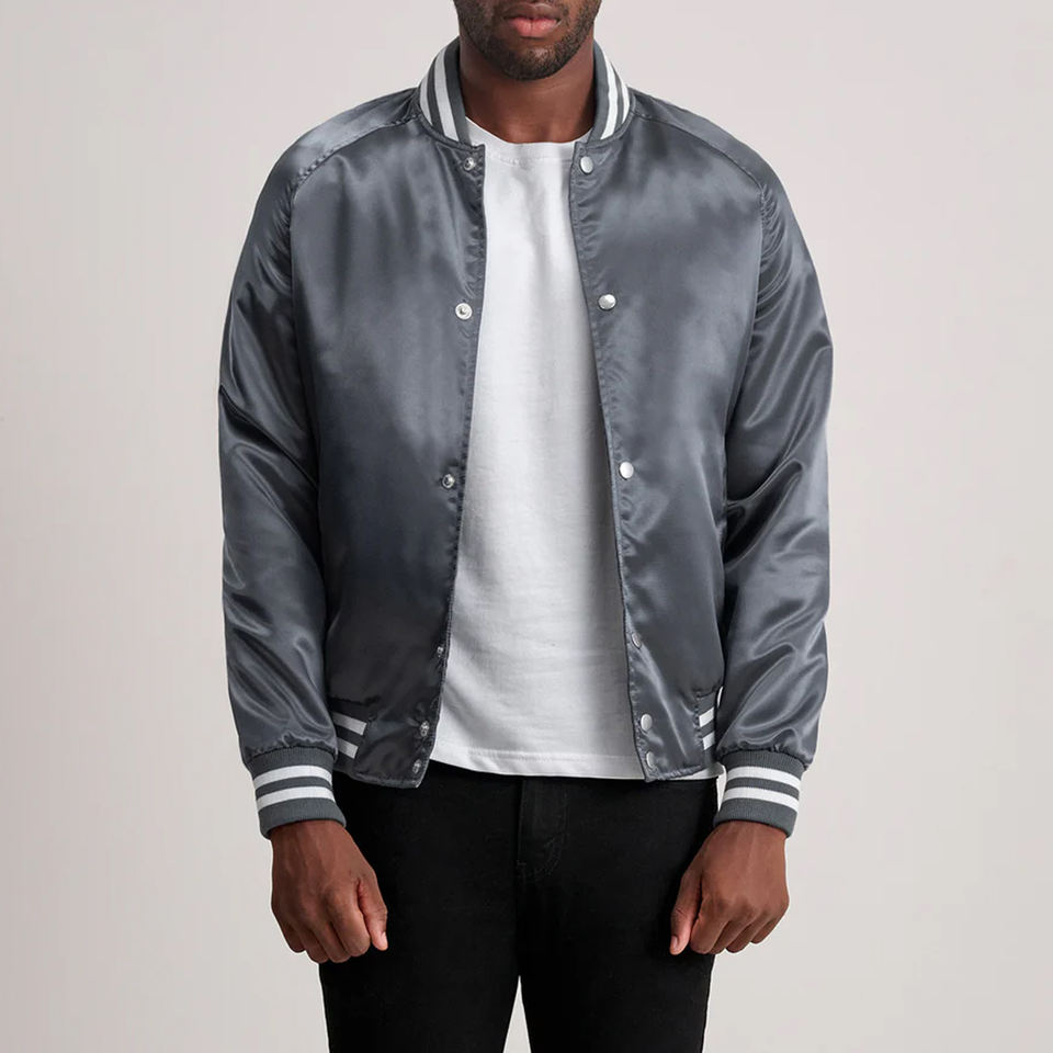 แจ็คเก็ตวาร์ซิตี้สีเทาซาตินมีฮู้ด แบรนด์ Xander รุ่น Stylish บุผ้าโพลีเอสเตอร์แบบควิลท์ ปิดด้วยกระดุม ปลายแขนและชายเสื้อถักแบบริบ