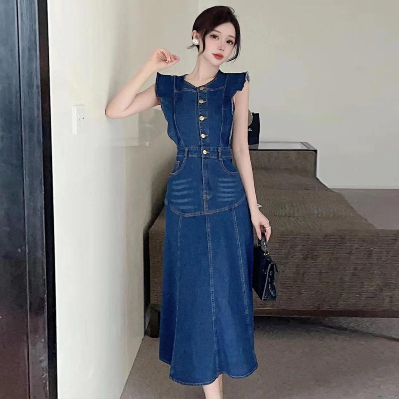 เดรสผ้ายีนส์คอกลมแขนกุดกระดุมแถวเดียวสำหรับผู้หญิงหรูหรา