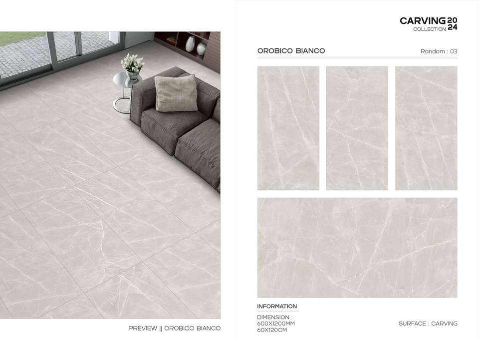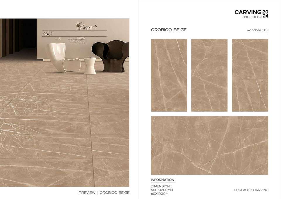 กระเบื้องพอร์ซเลนเคลือบเงาแบบมีลวดลายแกะสลักอย่างมีสไตล์ ออกแบบมาเพื่อใช้สำหรับปูพื้นและผนังขนาดใหญ่ในงานตกแต่งภายในอาคาร