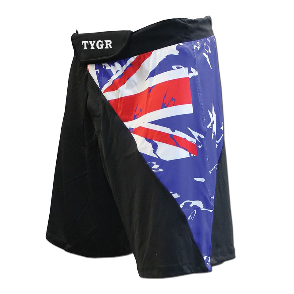 กางเกงขาสั้น MMA แบบระเหิดมีสไตล์กางเกงยีนส์กางเกงขาสั้นสำหรับออกกำลังกายกางเกงขาสั้นโพลีเอสเตอร์พิมพ์ลายพิมพ์ซับลิเมชันตามสั่งของคุณ