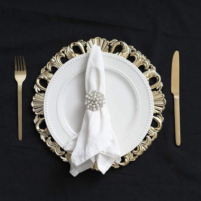 จานชาร์จโลหะสำหรับตกแต่งงานเลี้ยงงานแต่งงานที่มีสไตล์การออกแบบที่หรูหราเหมาะสำหรับการจัดวางโต๊ะอาหารที่ทันสมัย