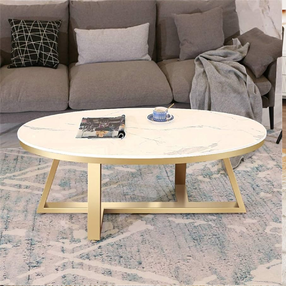 ท็อปหินอ่อนสีขาวสุดเก๋พร้อมขาโค้งโลหะสีทองและโต๊ะกาแฟชามล่าง