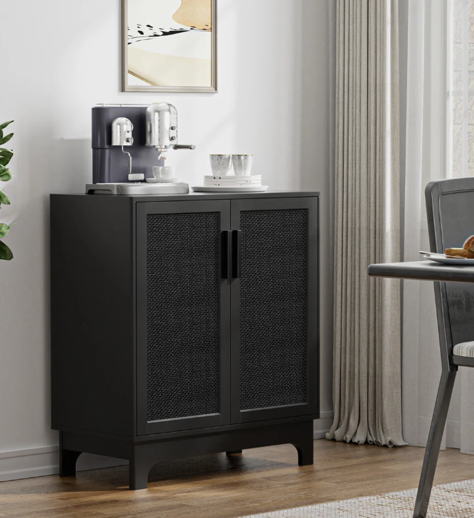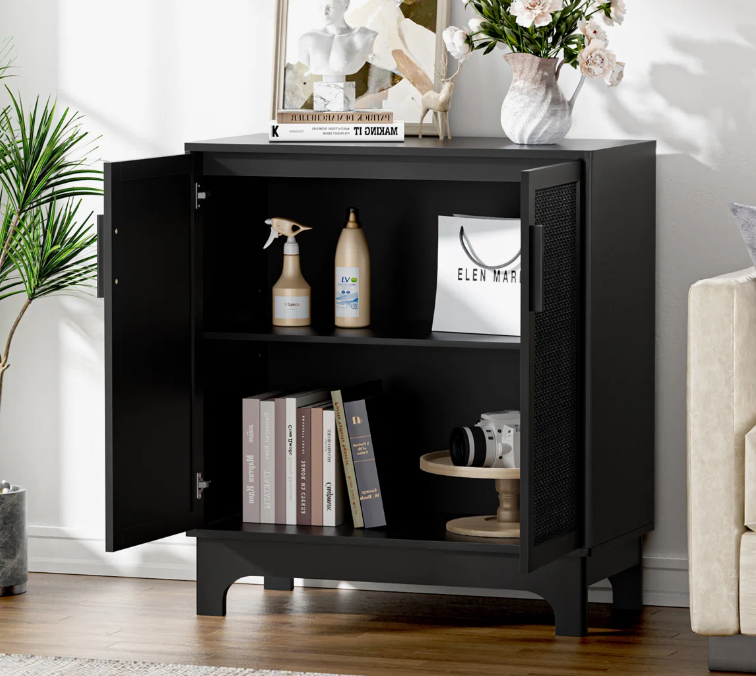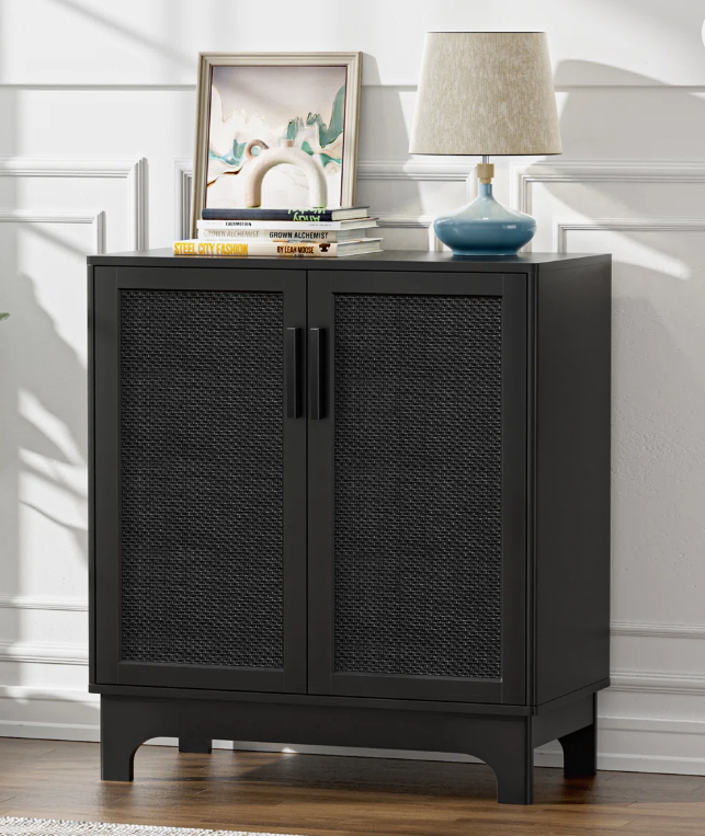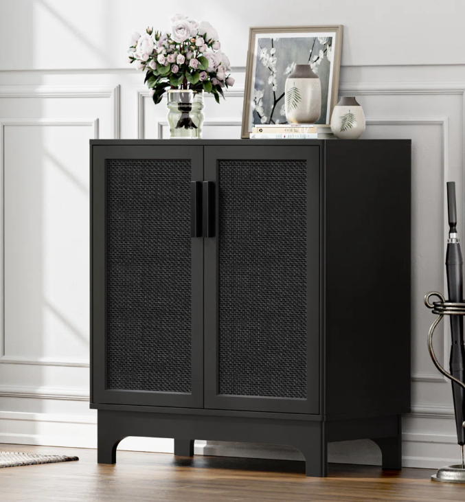 ตู้ไม้สองบานประตูดีไซน์ทันสมัยพร้อมมือจับสีดำ ตู้เก็บของสีดำสวยงามสำหรับตกแต่งห้องนั่งเล่น ห้องนอน และทางเข้าบ้าน