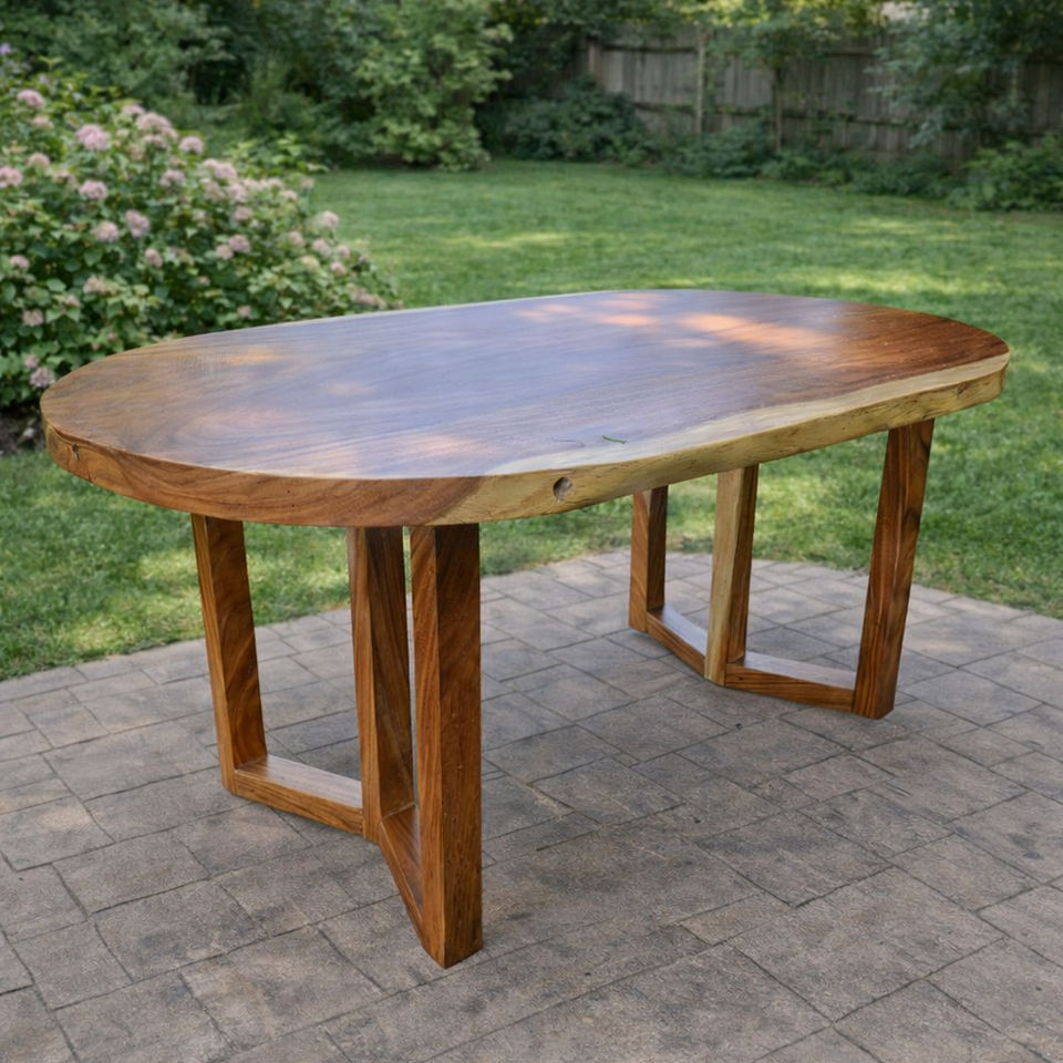 โต๊ะรับประทานอาหารรูปวงรีไม้สัก ดีไซน์หรูหรา ทันสมัย เรียบง่าย ไม่ซ้ำใคร ขาสามเหลี่ยมแข็งแรง สำหรับบ้านและร้านกาแฟ