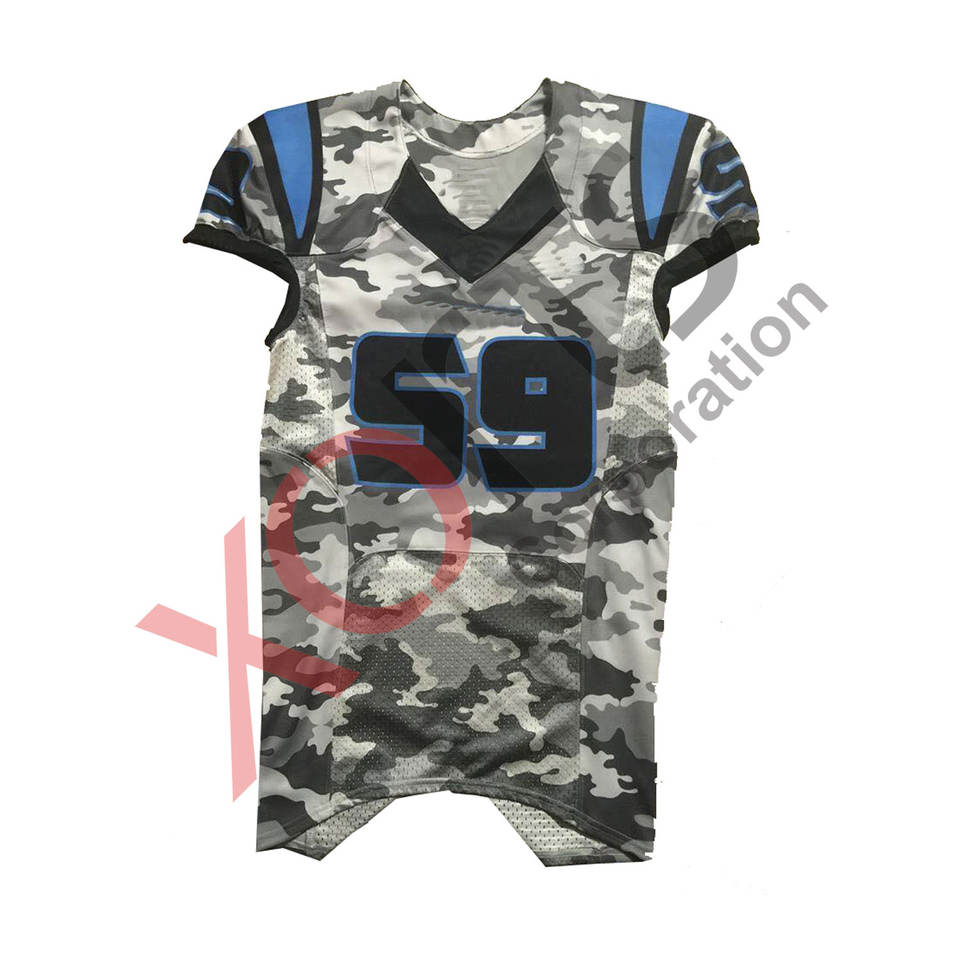 เสื้อเจอร์ซีย์ฟุตบอลอเมริกันพิมพ์ลายพรางเสื้อระบายอากาศมีขนาดพิเศษปักลายปะติดผ้า rexin สีเงิน