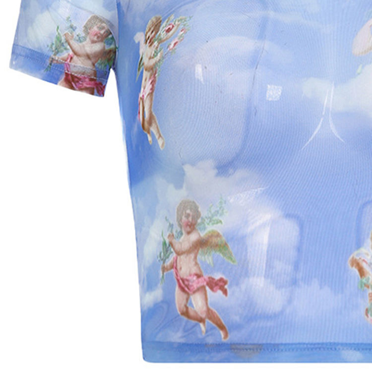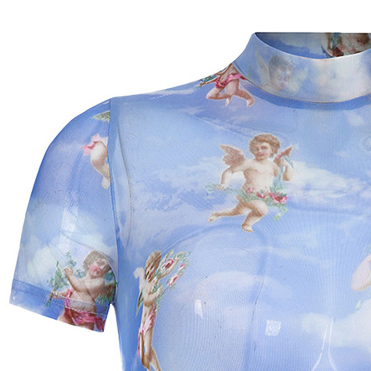 เสื้อครอปตาข่ายพิมพ์ลายดิจิตอลเสื้อฟิตเนสเซ็กซี่เสื้อครอปสไตล์ร้อนคอกลมพิมพ์ลายตาข่าย
