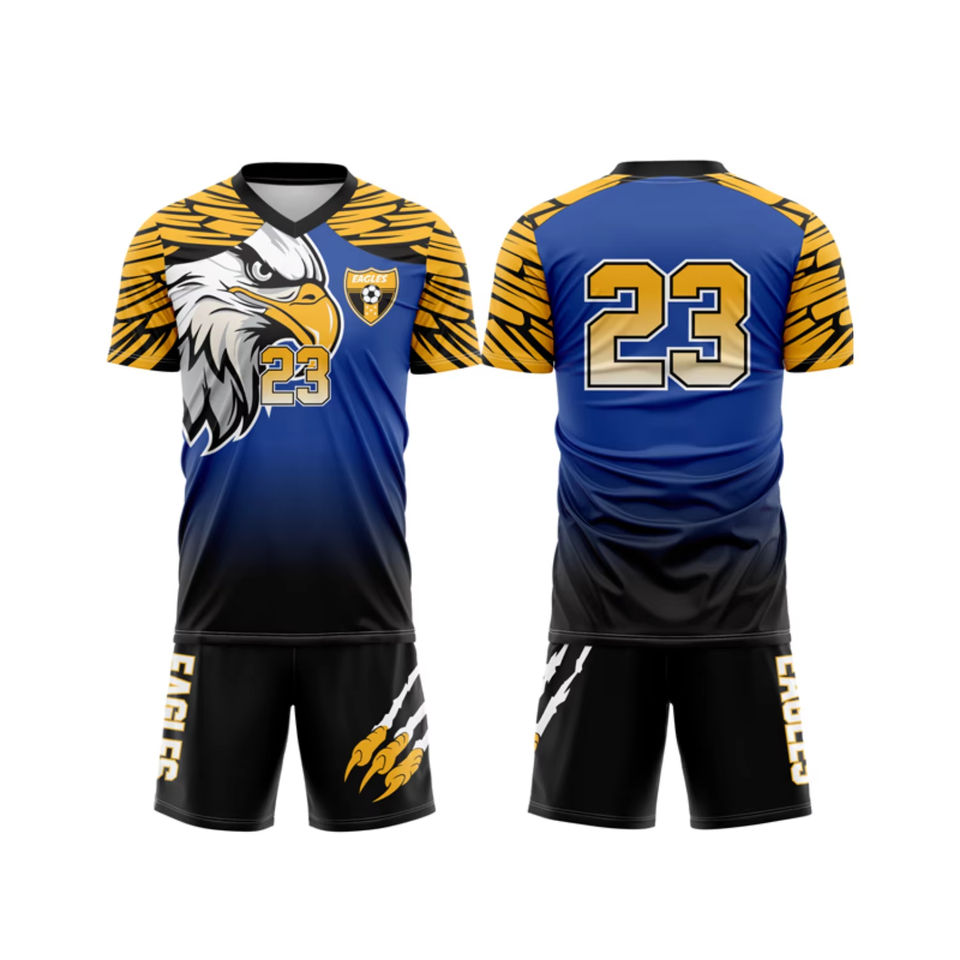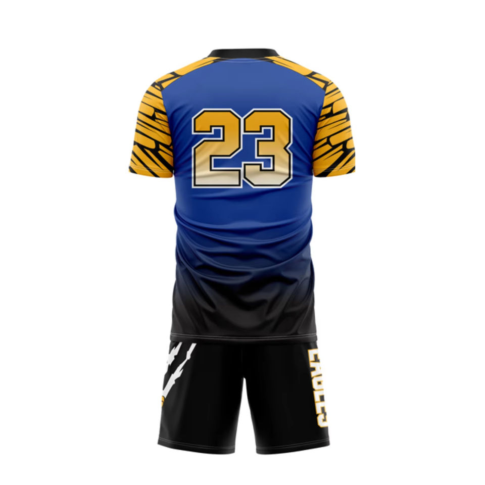 ชุดเครื่องแบบฟุตบอลพิมพ์ลายระเหิด100% ผ้าโพลีเอสเตอร์ระบายอากาศแห้งเร็วรวมถึงถุงเท้าและกระเป๋าด้านบน