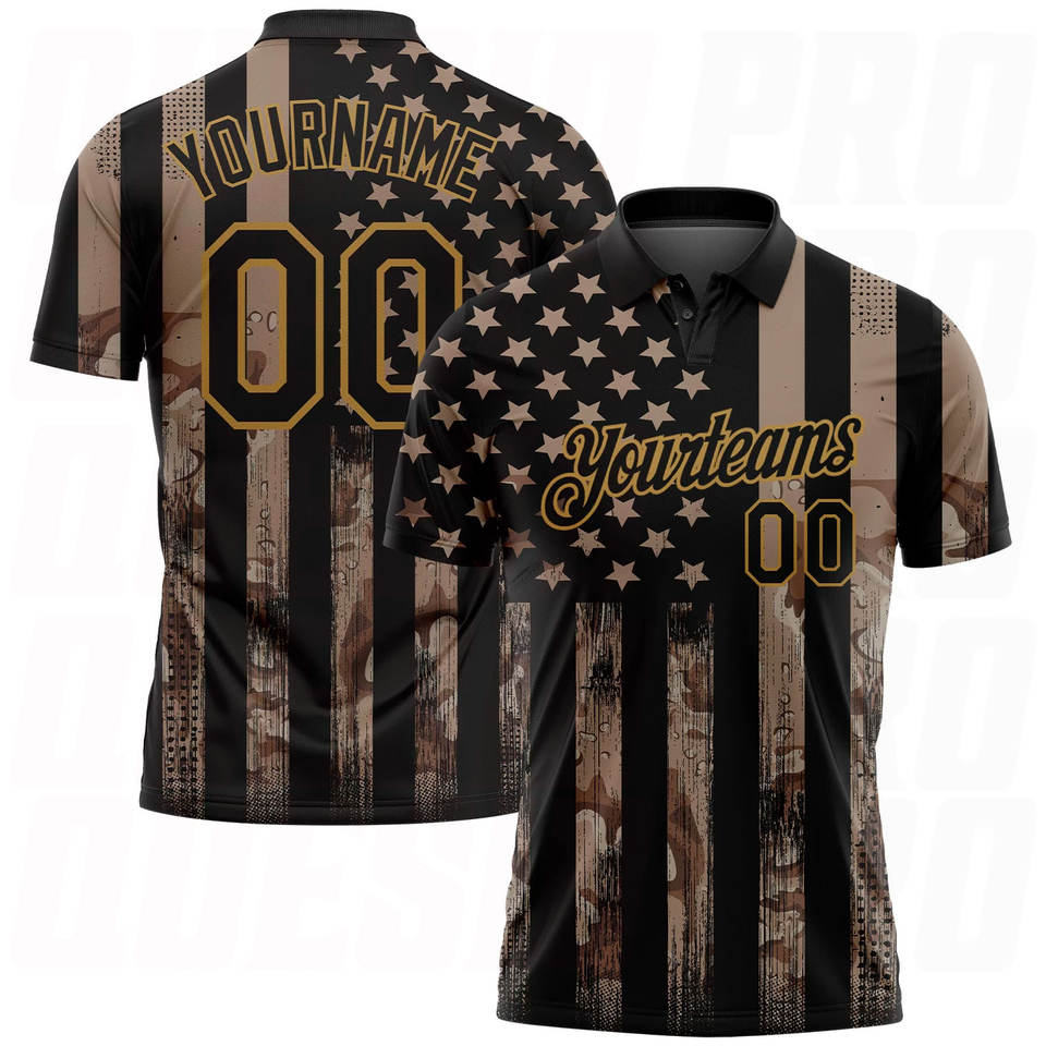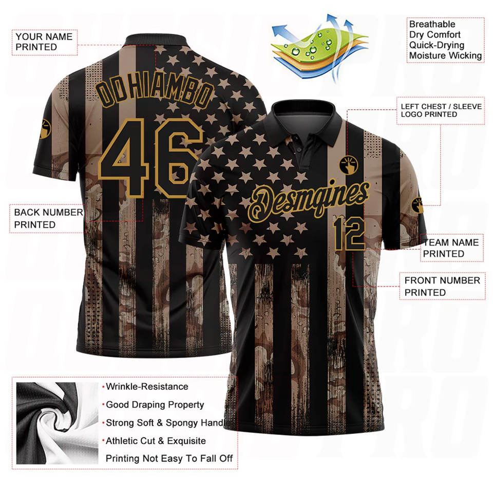 เสื้อโปโลกอล์ฟพิมพ์ลายแบบซับลิเมชั่น โพลีเอสเตอร์ แขนสั้น ระบายอากาศ ต้านเชื้อแบคทีเรีย เสื้อโปโลลายพรางสีดำแบบสั่งทำ