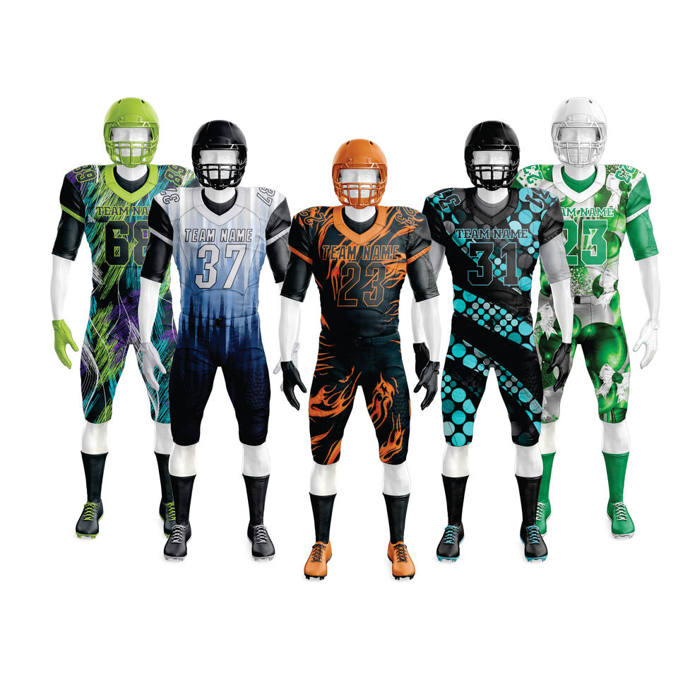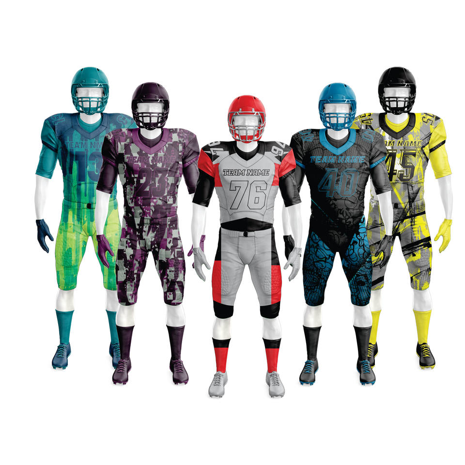 ชุดเสื้อเจอร์ซี่อเมริกันฟุตบอลสำหรับผู้ชายชุดเครื่องแบบโพลีเอสเตอร์ออกแบบโลโก้ได้ตามต้องการพิมพ์ด้วยการระเหิดพร้อมหมายเลขธงสำหรับใส่เล่นกีฬา