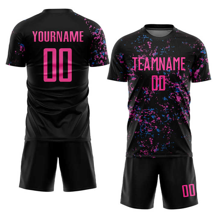 ชุดฟุตบอลพิมพ์ลายแบบ Sublimation ชุดฟุตบอลน้ำหนักเบาสำหรับเยาวชน ชุดสโมสร OEM แบบกำหนดเอง สีดำชมพู