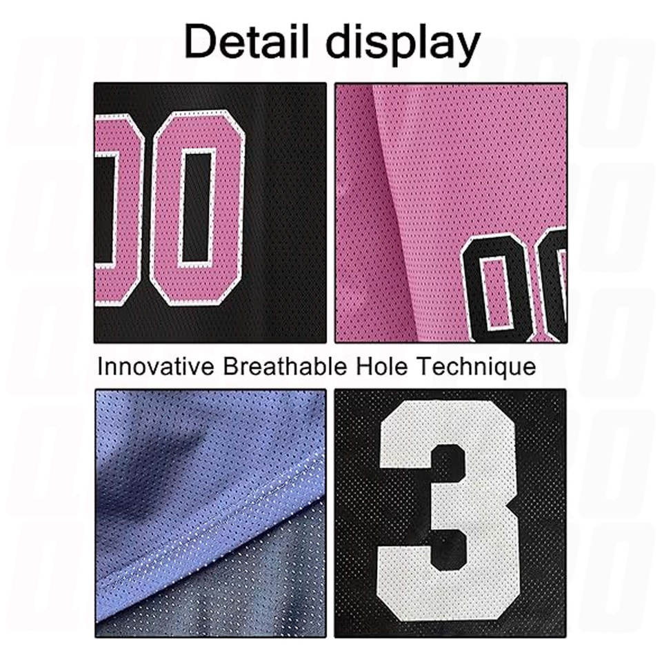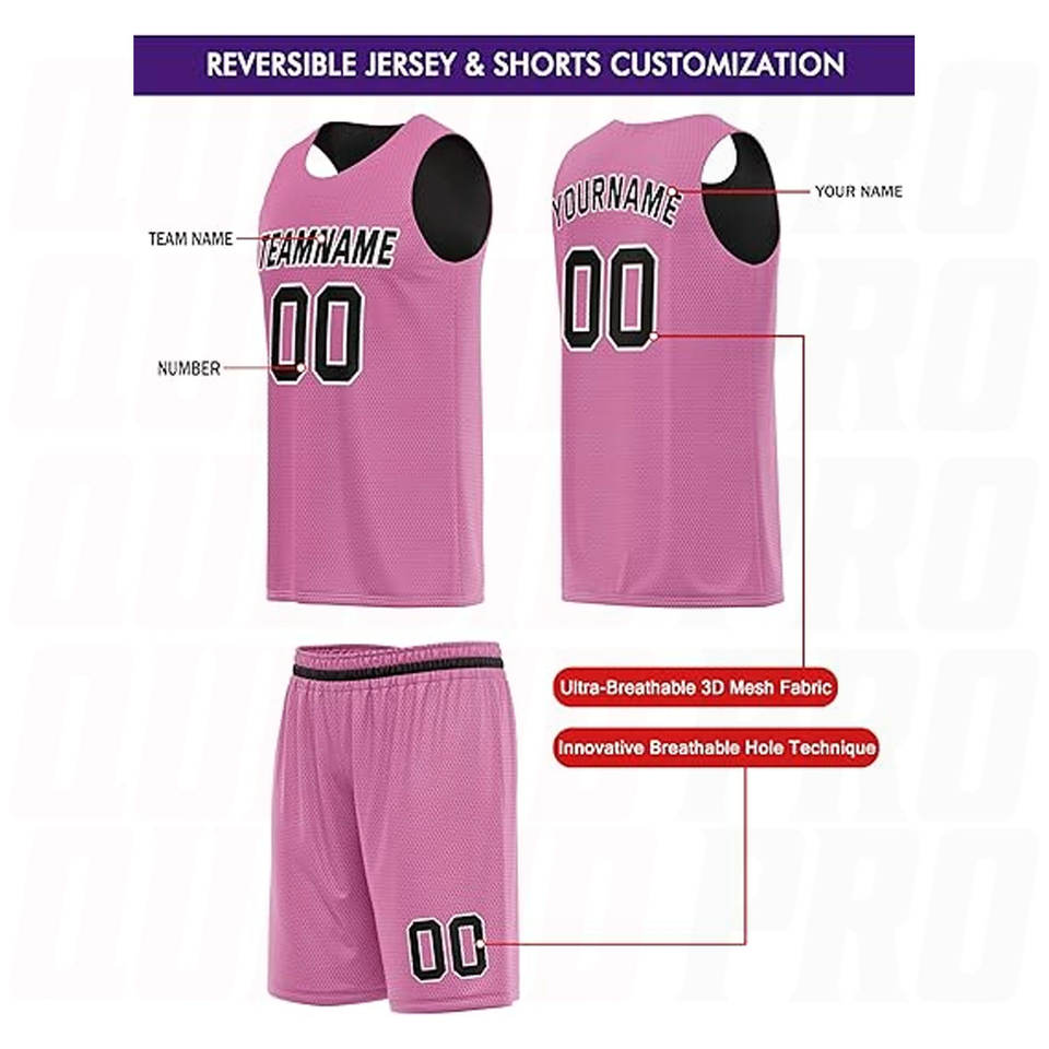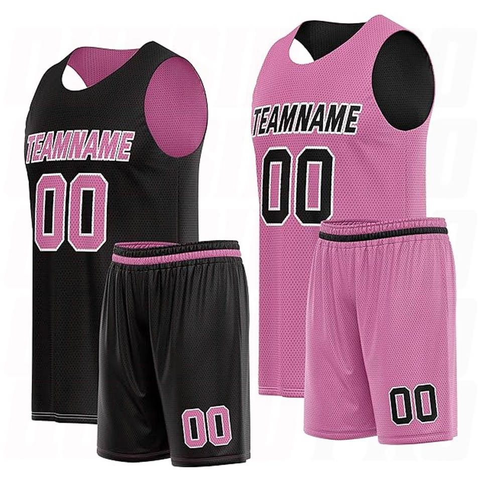 ชุดยูนิฟอร์มบาสเก็ตบอลแบบซับลิเมชั่น สีดำและชมพู พร้อมสกรีนชื่อและโลโก้ตามสั่ง เสื้อบาสเก็ตบอลและกางเกงขาสั้นระบายอากาศสำหรับฤดูร้อน