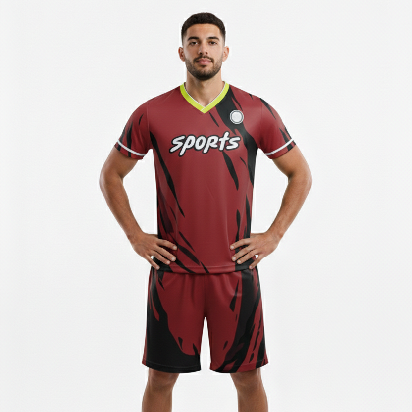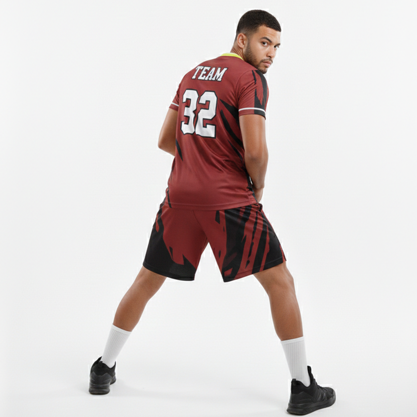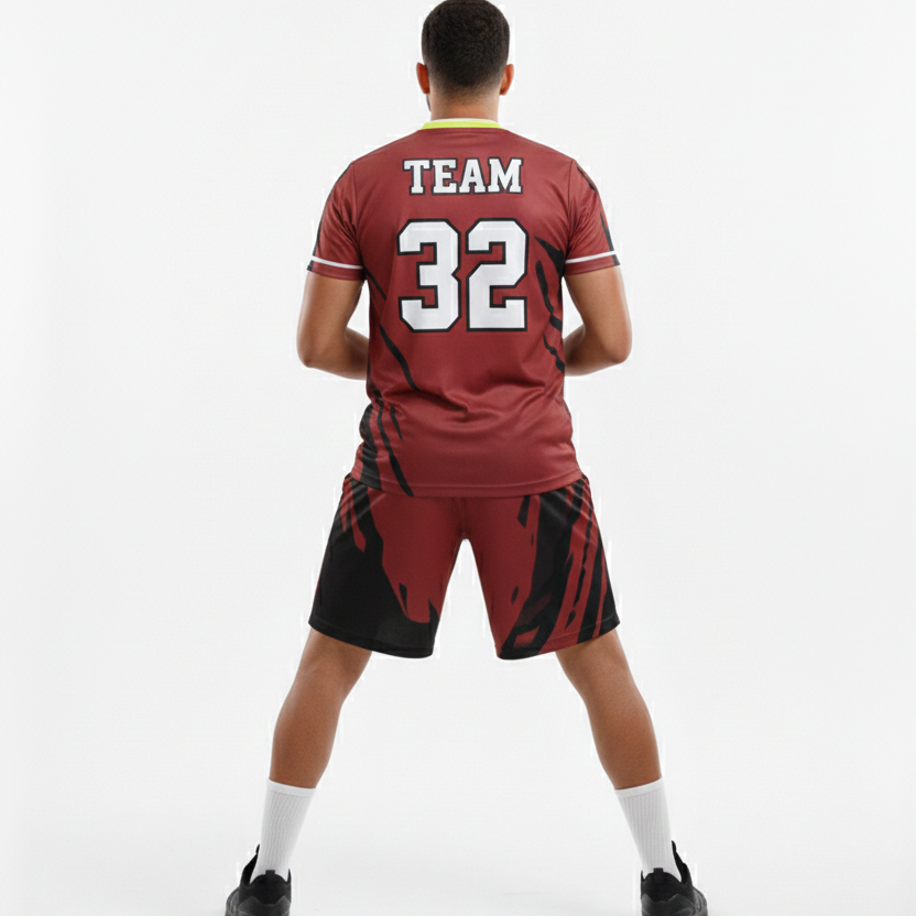 ชุดฟุตบอลพิมพ์ลายแบบซับลิเมชั่น ออกแบบลายเองได้ ชุดบาสเก็ตบอลสีแดงเลือดหมู คอวี ราคาขายส่ง
