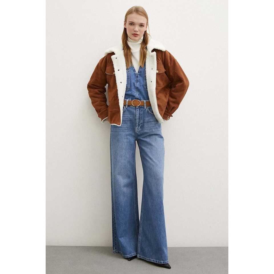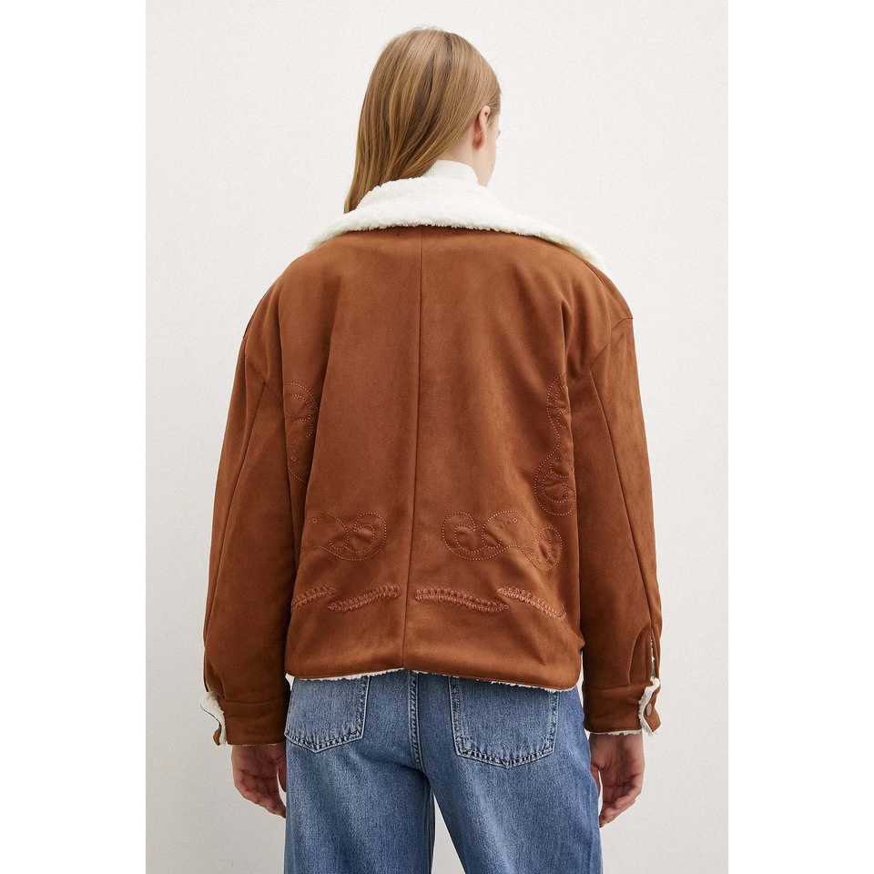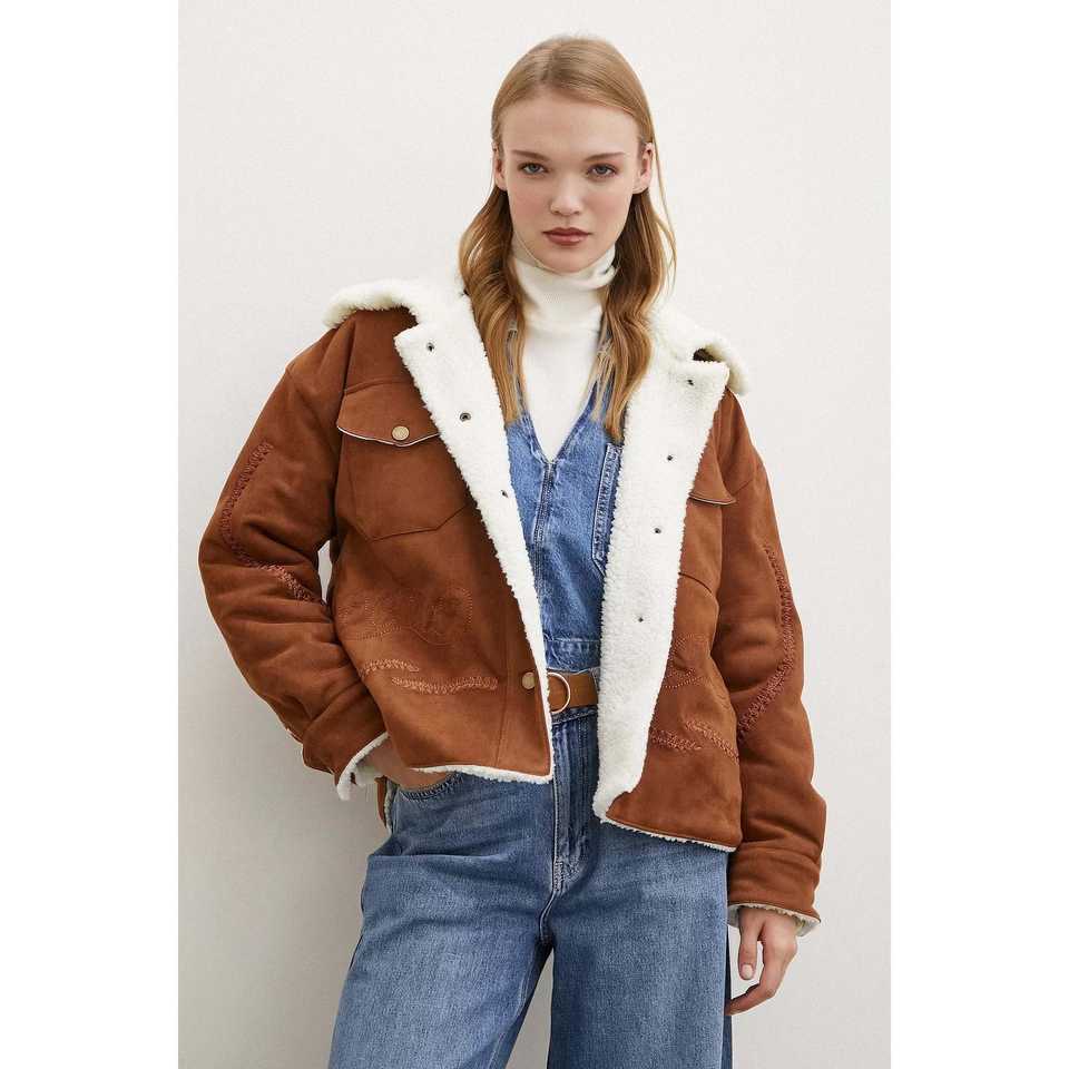 เสื้อโค้ทหนังกลับสีกาแฟสำหรับผู้หญิง แขนยาว ซับในขนสัตว์เทียม ให้ความอบอุ่น