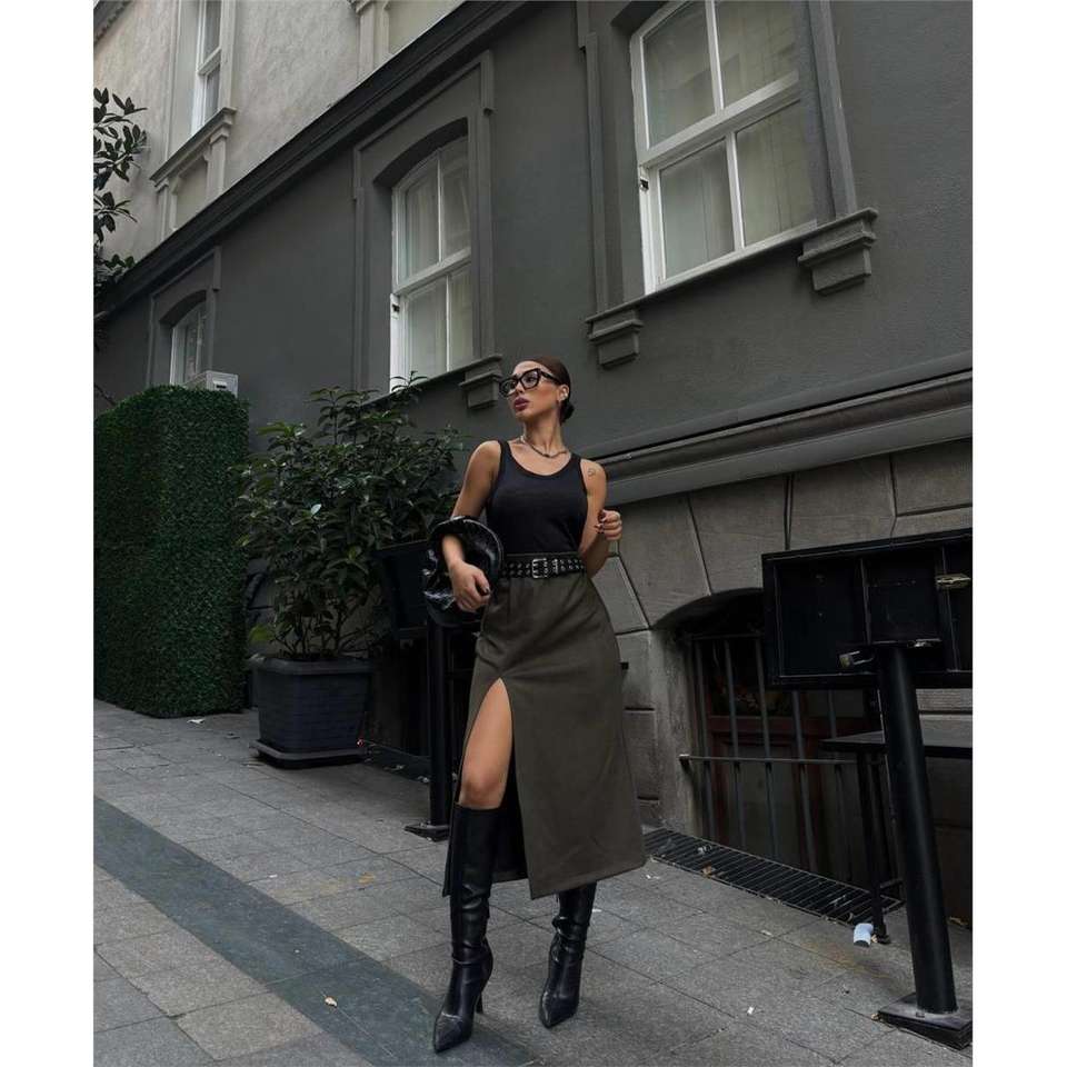 กระโปรงทรงดินสอผ้าหนังกลับมีดีเทลผ่าข้าง สีกากี ทรงเข้ารูปสำหรับผู้หญิง เอวธรรมชาติ