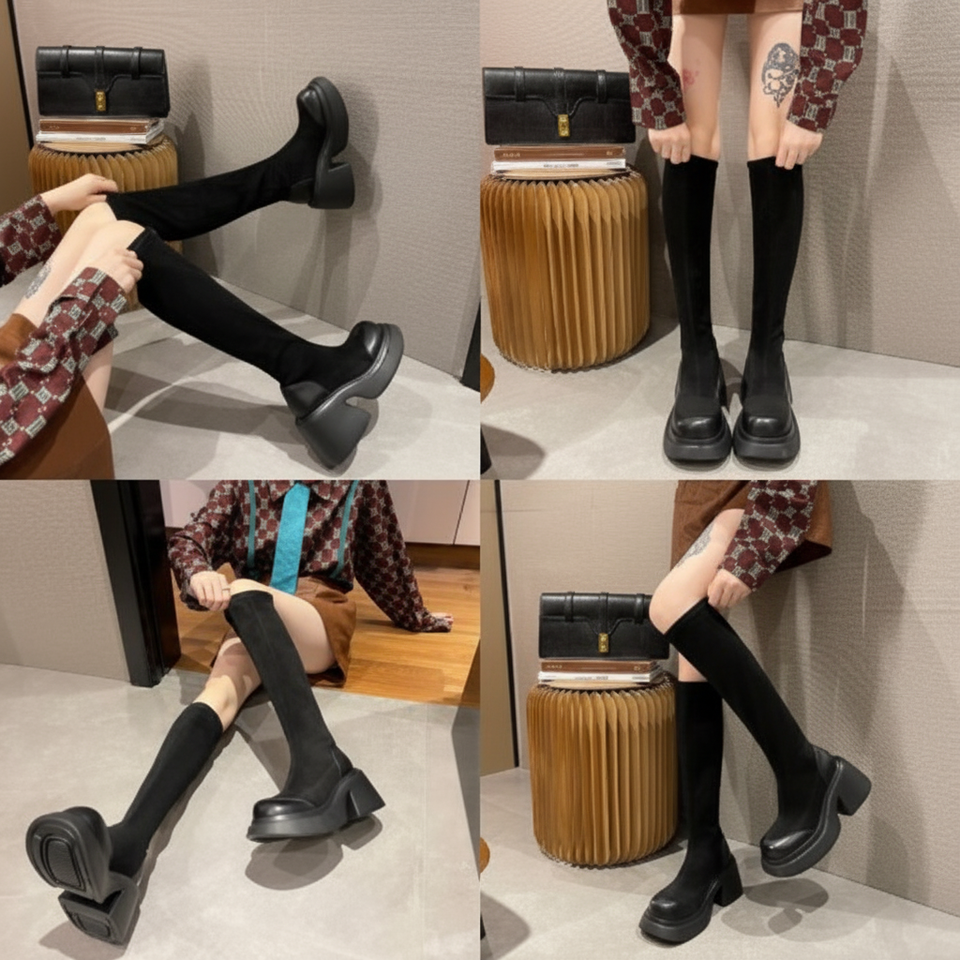 ถุงเท้าหนังนิ่มแบบเรียบง่ายบางเฉียบพร้อมส้นรองเท้าบล๊อกที่หรูหราและมีสไตล์