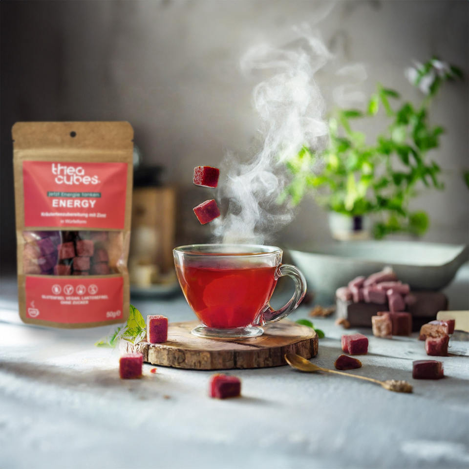 ก้อนชาสมุนไพรปราศจากน้ำตาลรูปแบบก้อนที่เป็นเอกลักษณ์, มังสวิรัติ, ชาพลังงานธรรมชาติพร้อมดื่ม