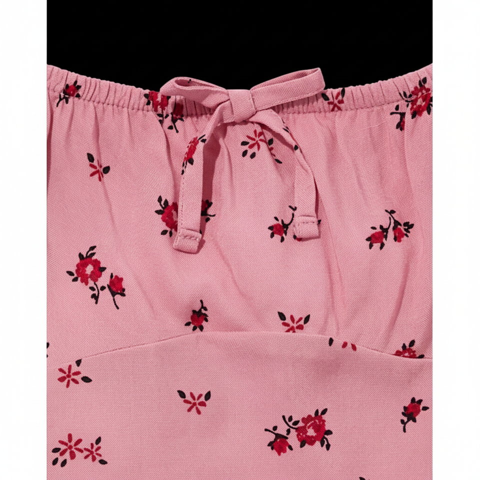 ความพอดีและการออกแบบ:คอเหลี่ยมยางยืดพร้อมโบว์ แขนพองยาวถึงข้อศอก