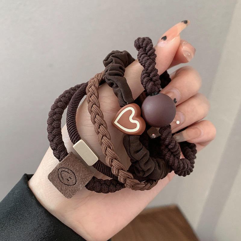 Suitable for Women's Daily Wear Simple Trendy Brown and Black Lace-Up Heart Smiley Face Braided Elastic Hair Tie Set